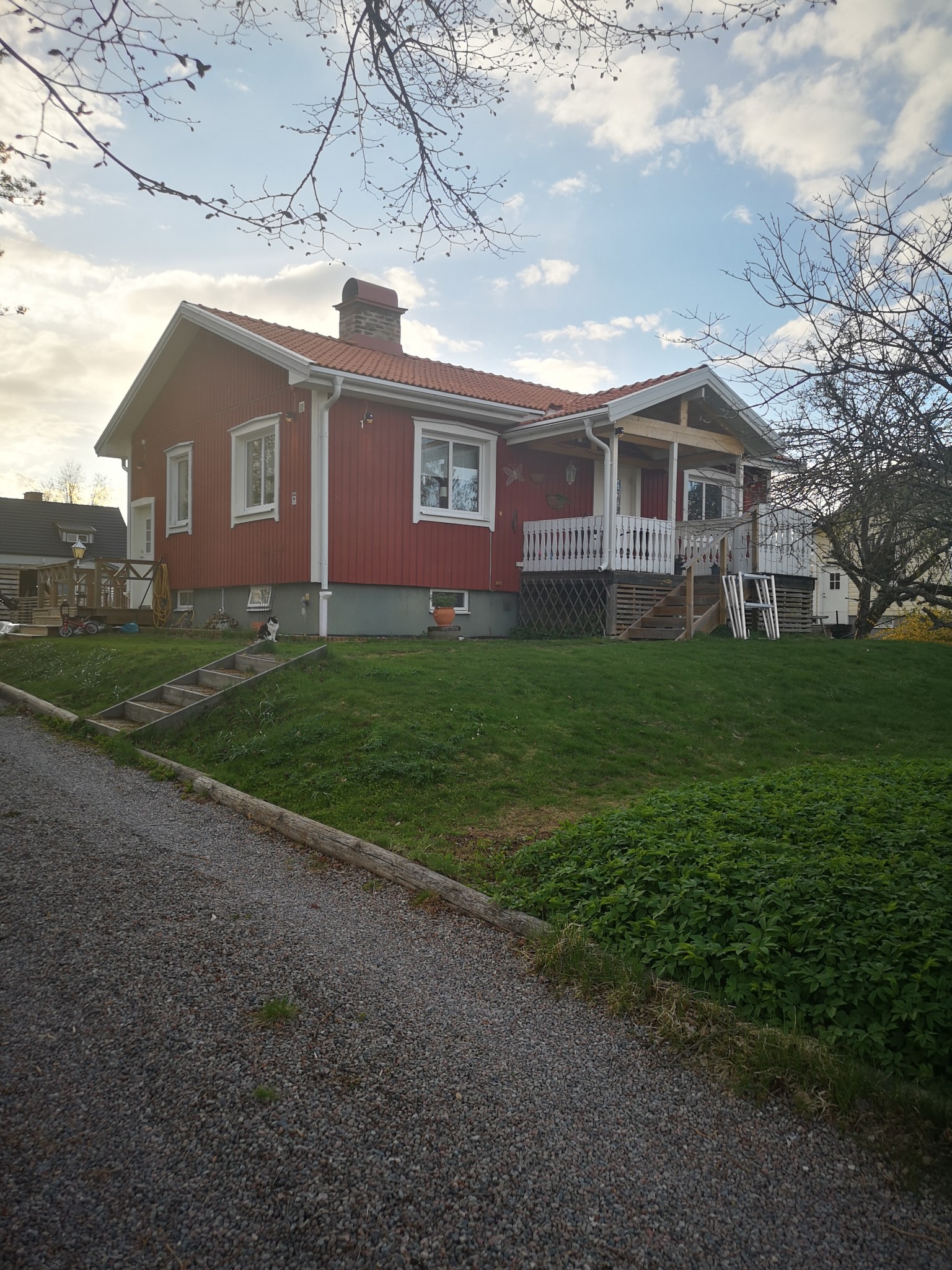 Ja la nyss om taket ja med, blev ett tegeltak 2 kupigt. Hade pannor till halva kåken o köpte till andra halvan, gjorde även om entrén o klämde dit ett sadeltak. Summan landa på 28 000, mtrl o de ja tog hjälp av va en lokal plåtis för skorstenen![]()