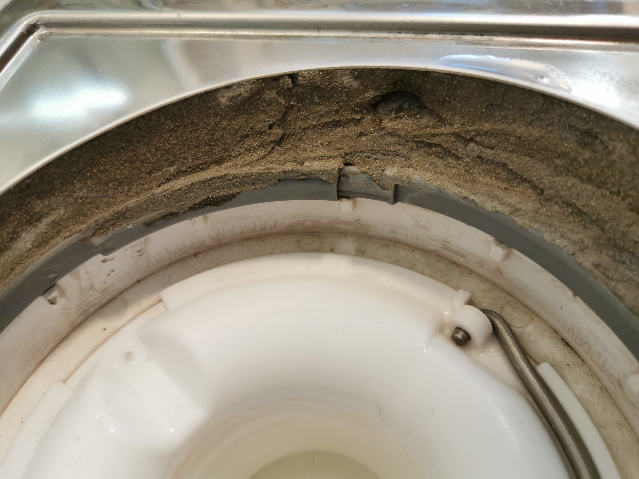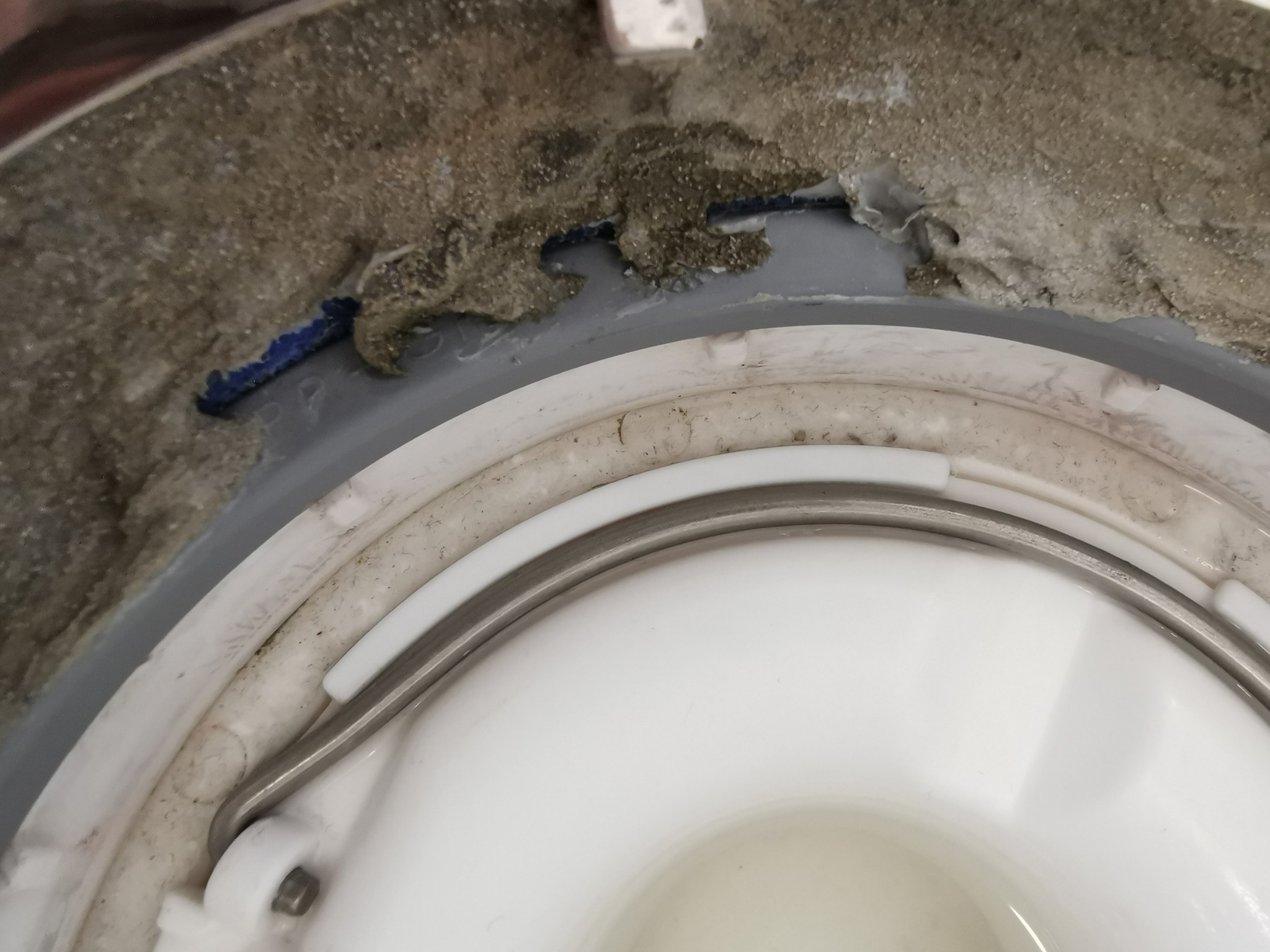 Närbild på dåligt monterad brunn i badrum med synlig silikon och överflödigt borrmaterial.