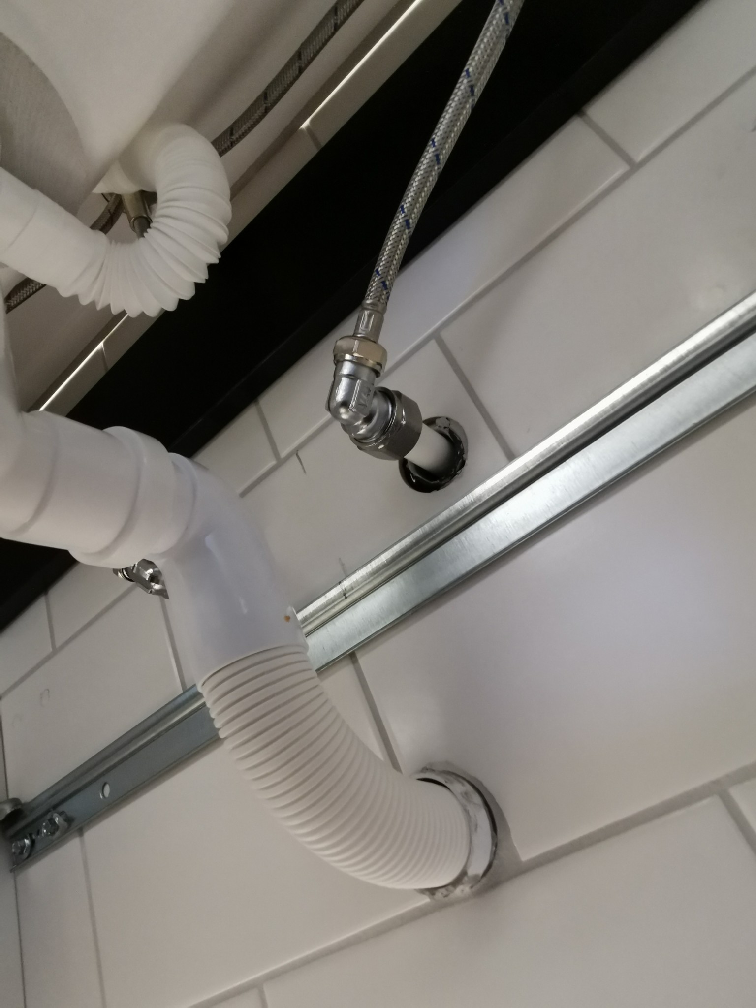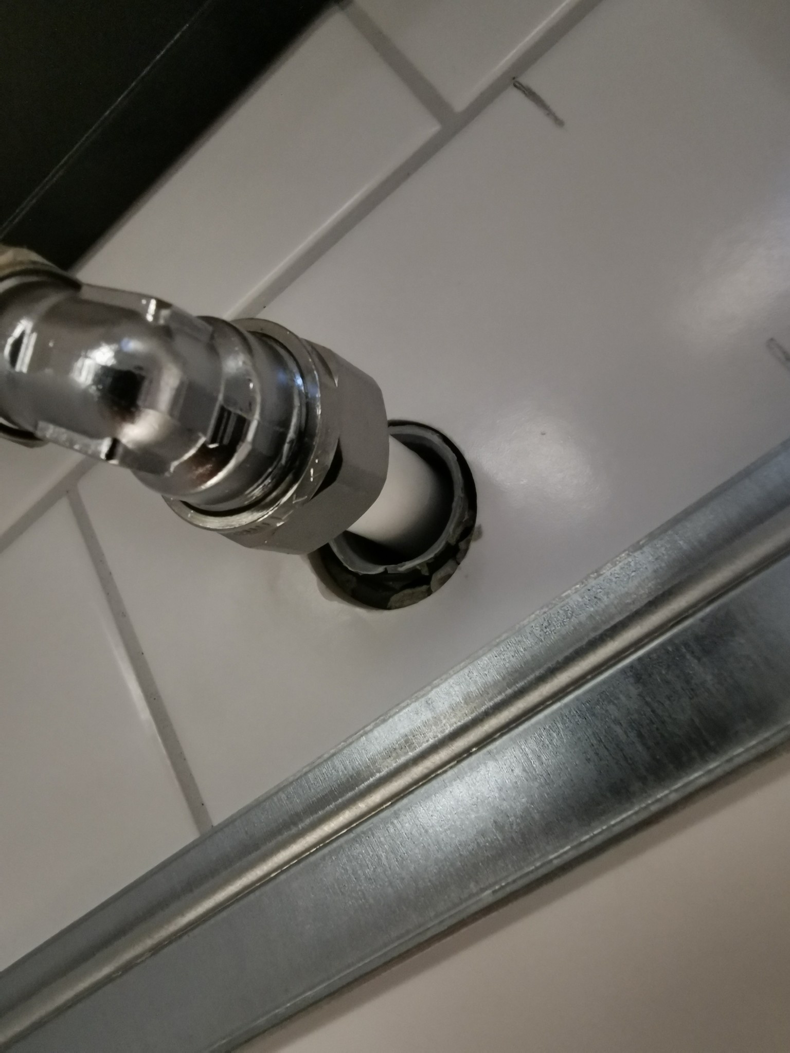 Undervy av vattenrör och avlopp under handfat med synlig silikon runt genomföring och avsaknad av avstängningsventil.