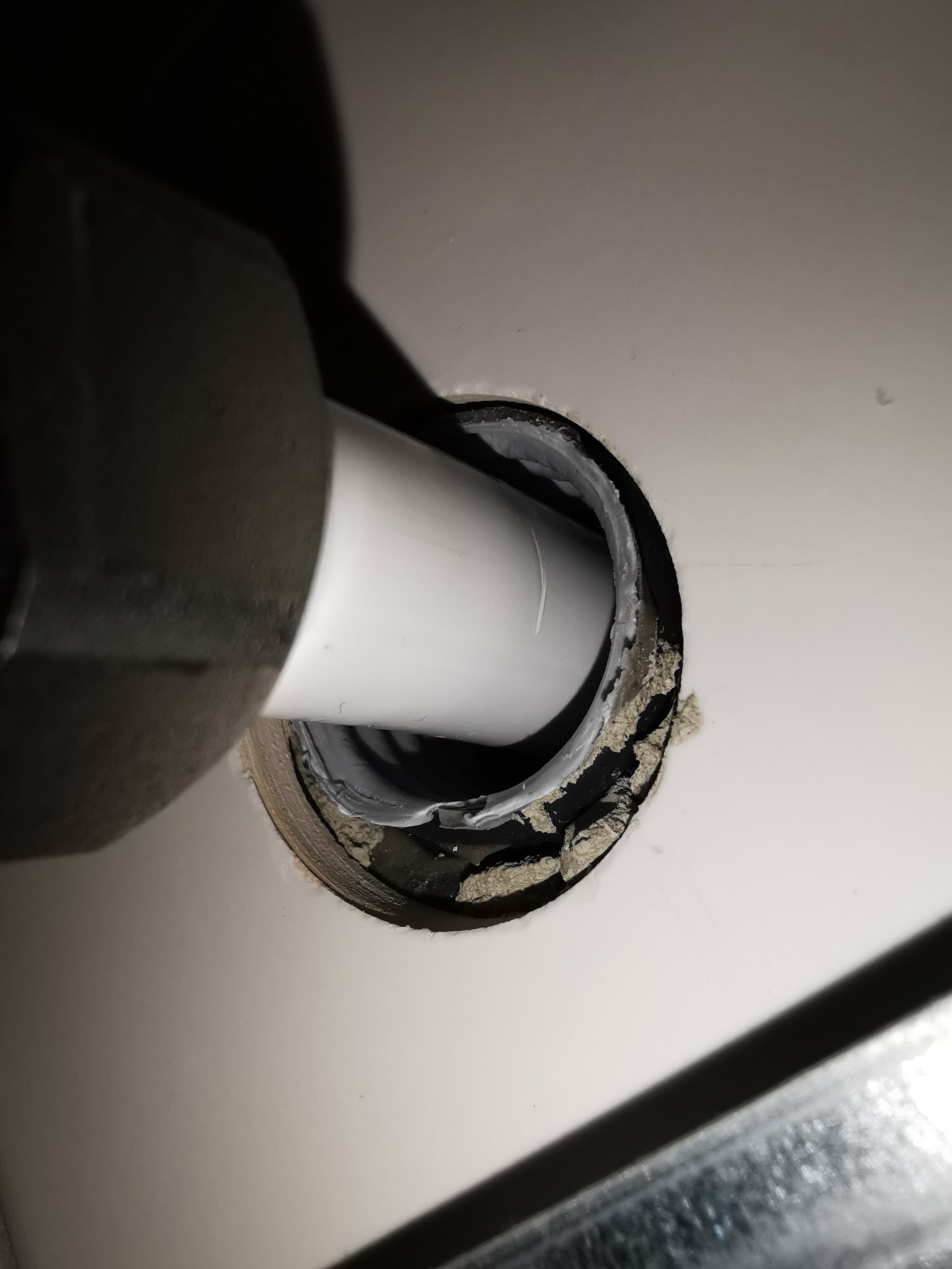 Närbild av ett rör som går in i en vägg med dålig tätning och synliga hål fyllda med silikon.