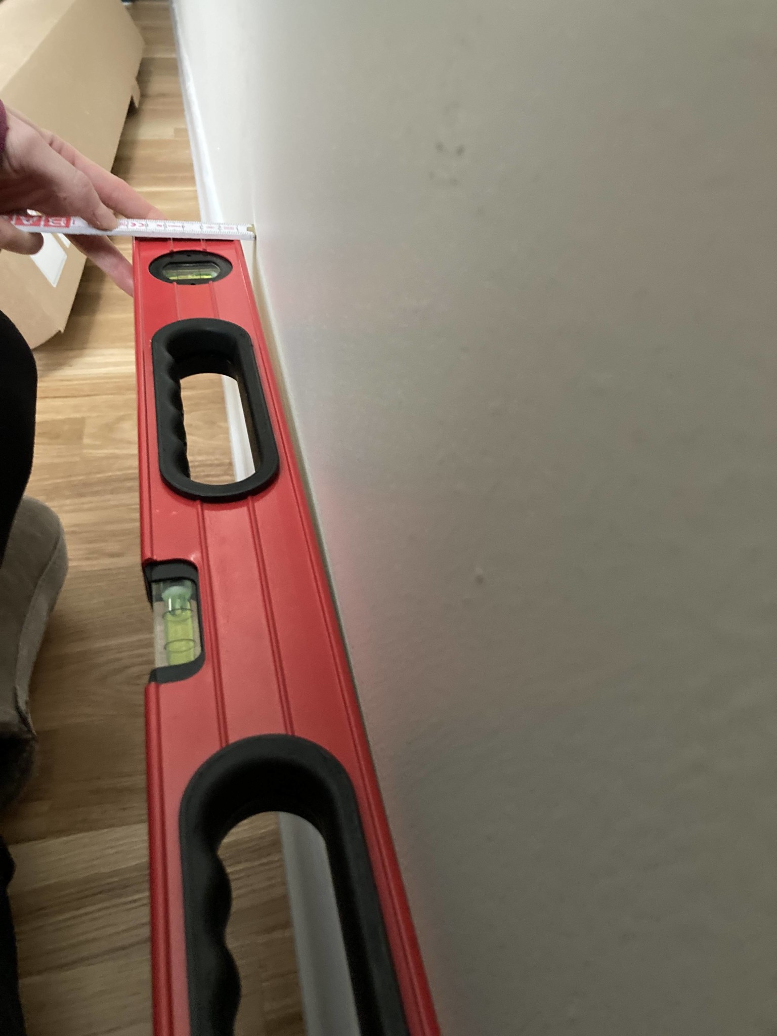 Vattenpasset är 60 cm, metallprofilen är 2 m lång. Vattenpasset hålls stumt mot väggen invid hörnet och metallisten hålls så att ena änden är där väggen buktar ut mest och mätt ungefär där avståndet är som störst. Den senare mätmetoden verkar vara den som föreskrivs i AMA?