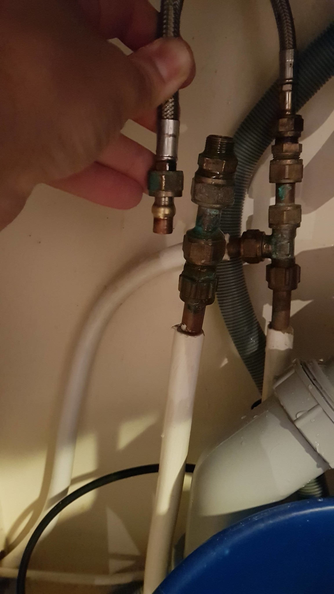 Eller så byter du klämringsskarven till en rak anslutning med 12 eller 15 mm klämring (mät röret nedanför kopplingen) och R10 gänga. Enklast blir nog att byta rörstumparna från T-kopplingen strax under. Kolla vilken typ av koppling det är, köp nya klämringar, rör i rätt dimension och raka skarvar, klämring till R10. På dina befintliga muttrar på T-kopplingarna kan du se vilket märke det är på kopplingen. Jag tycker det ser ut som VSH, men det kan vara något annat också.