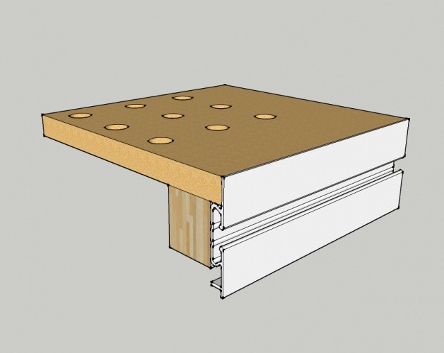 Konstruktionen blir en 45x45 mm regel i ram runt om, utan på den ramen på långsidorna blir det aluminiumskenan. Inuti ramen blir det 18 mm MDF med 19 mm hål. MDF skivan kommer liggga innanför aluminiumskenan och behöver bara nån enstaka skruv för att ligga still. Då kan man enkelt vända på den elelr byta den om/när det behövs.
