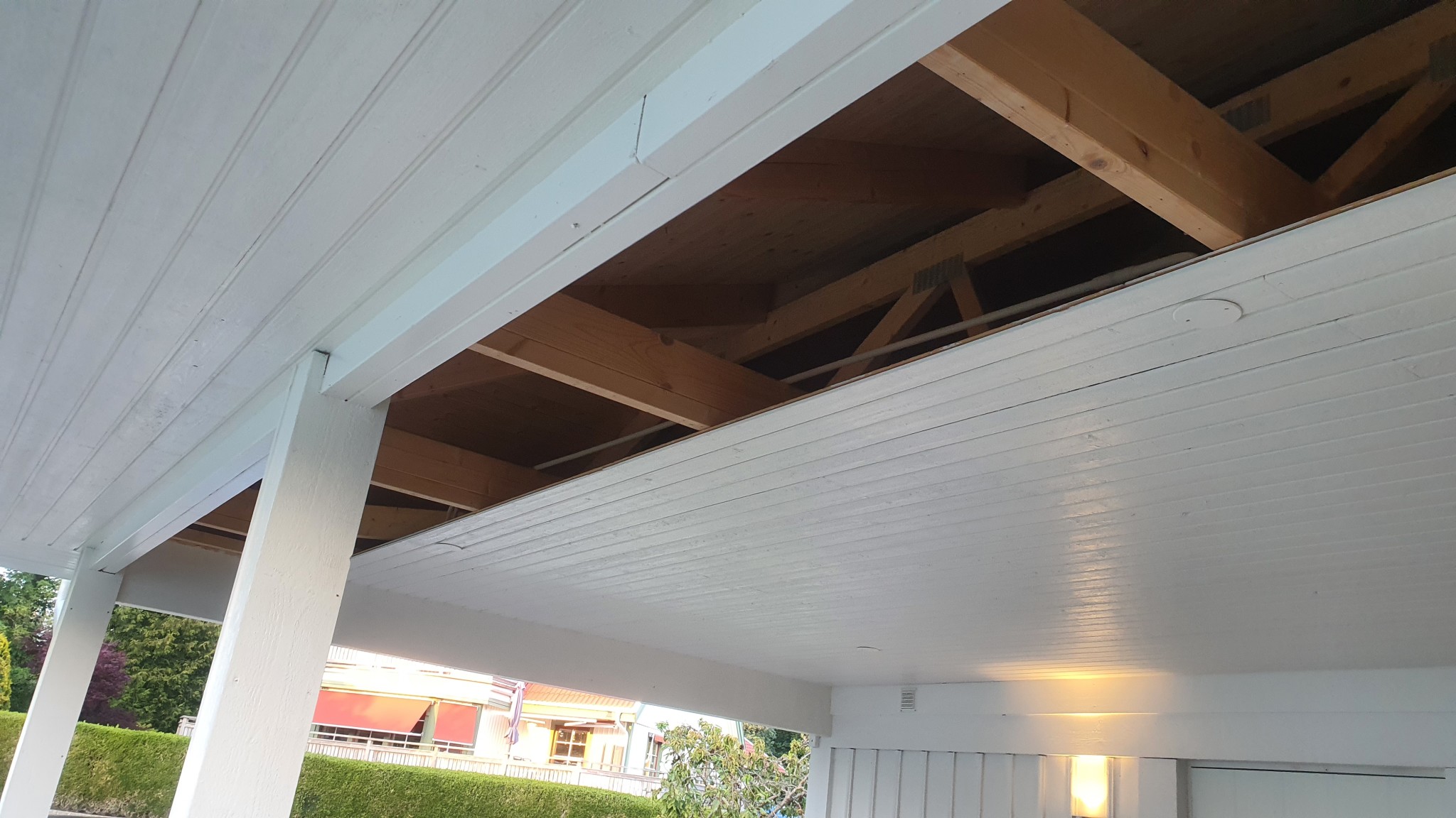 Längst bort i bild är takstolen som sitter ihop med huskroppen och hamnar till vänster om garageporten på ritningen ovan.