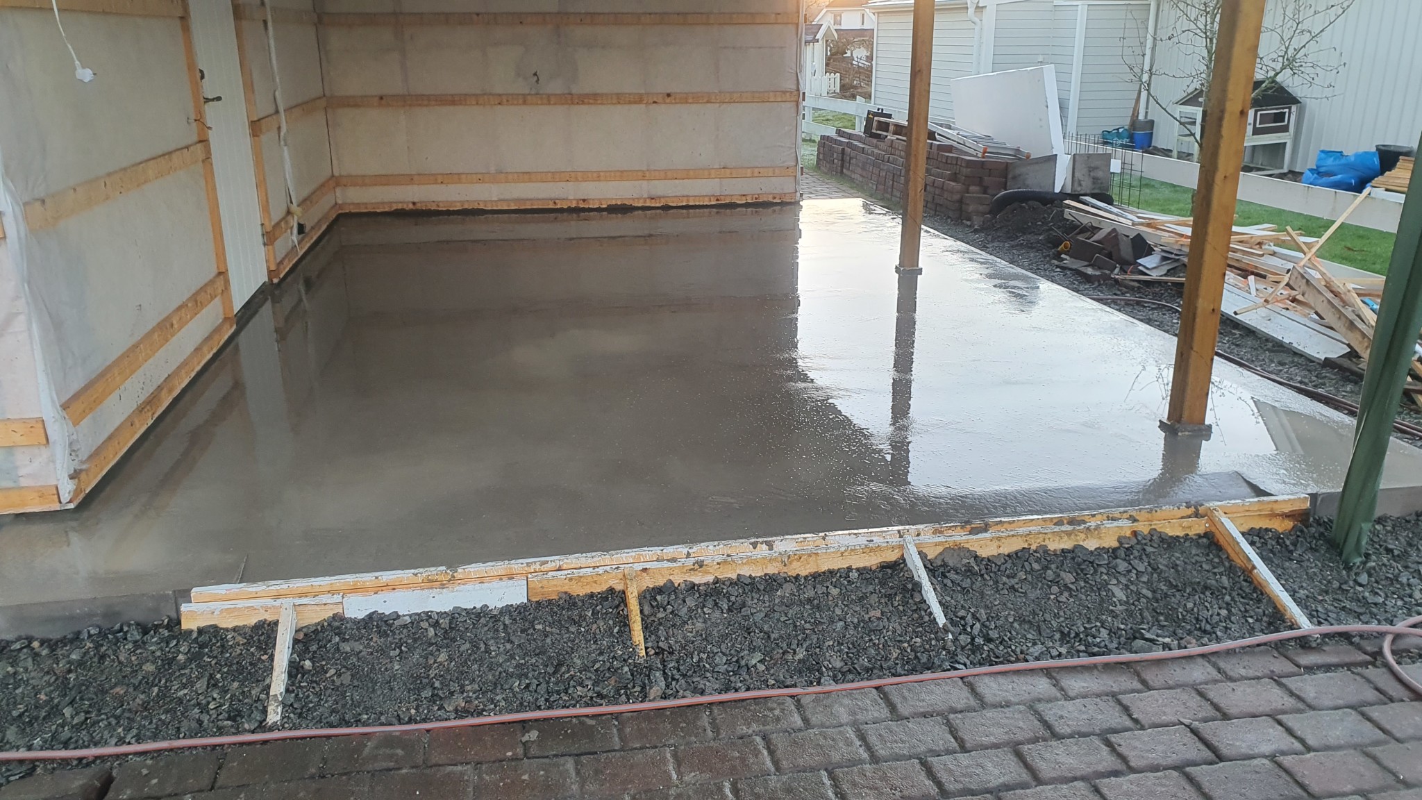Nu är äntligen gjutningen klar av garage-plattan (tidigare carport). Taket hålls för närvarande upp av två balkar som takstolarna ligger på och två stolpar. Detta ska bort och ersättas av väggarna jag bygger som hamnar utanför vilket ni nog ser på bilden.
