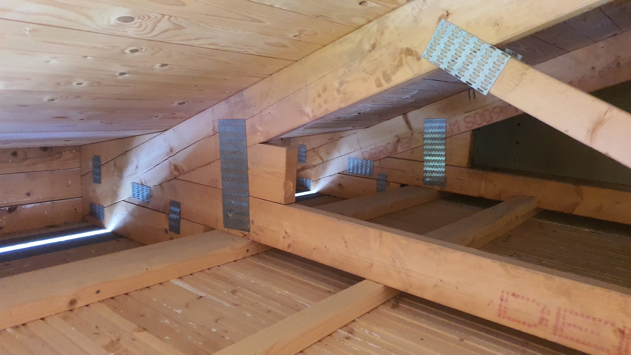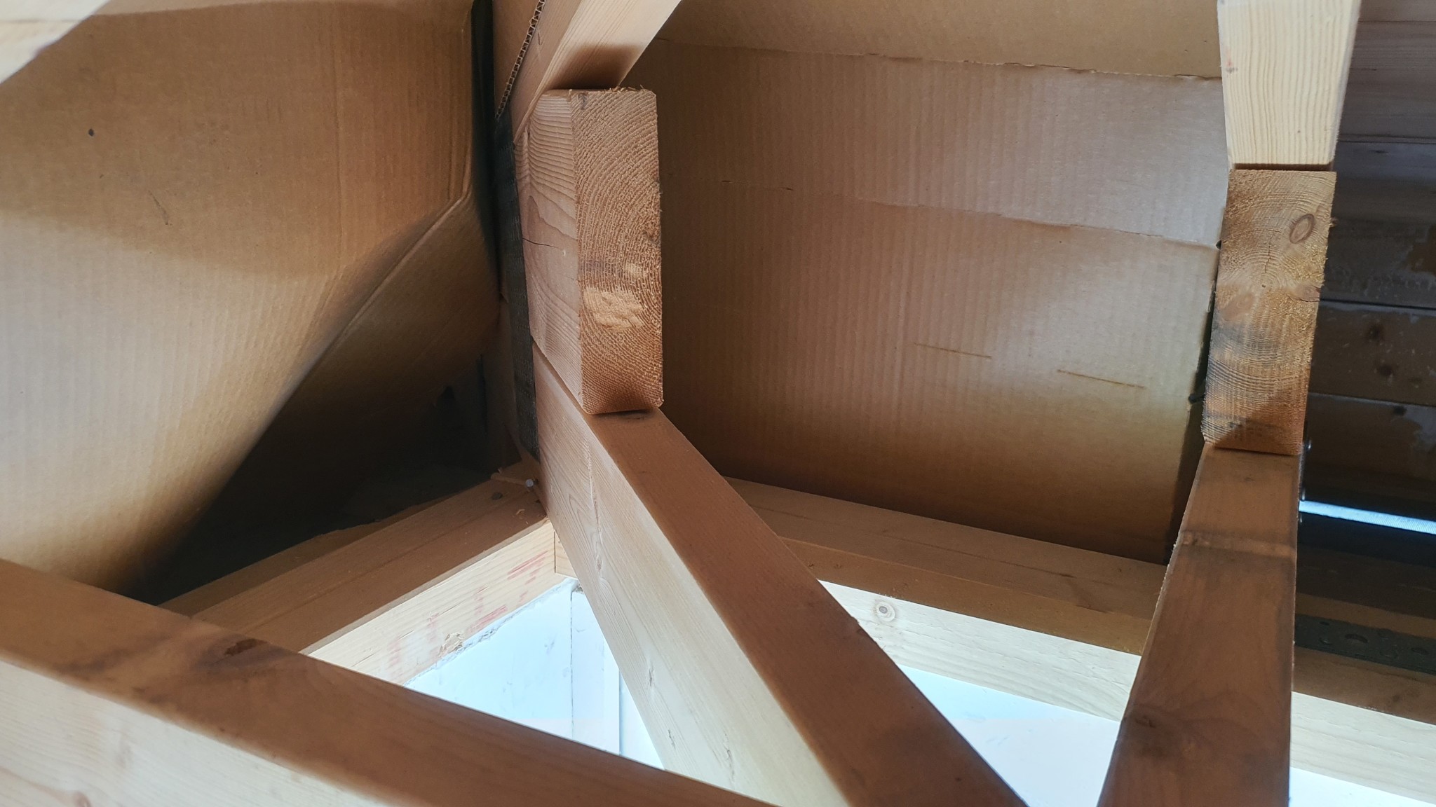 Här kan man se nuvarande bärande balkar/stolpar på det valmade taket.