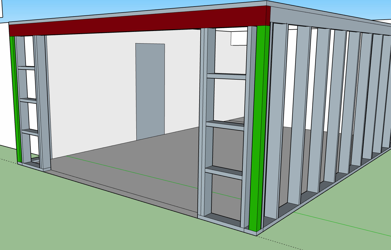 Jag har räknat med att bygga ytterväggarna med 145x45. Jag bör väl ha en stående regel som avväxling vid hammarbandet? Denna väggen kommer ju byggas på plats och inte resas, så jag måste börja med syllen och hammarbandet och därefter sätta reglarna väl?