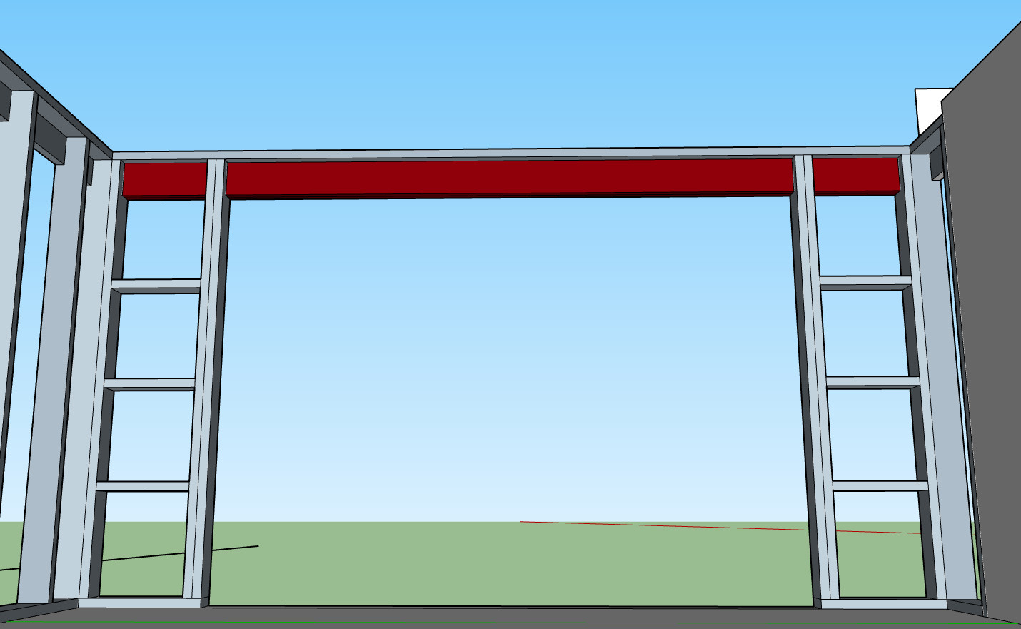 Rödmarkerat på bilden är 2st 42x180 limträbalkar som är 4,5m långa och lastas av med hjälp av två stycken 90x90 limträpelare (markerade i grönt).