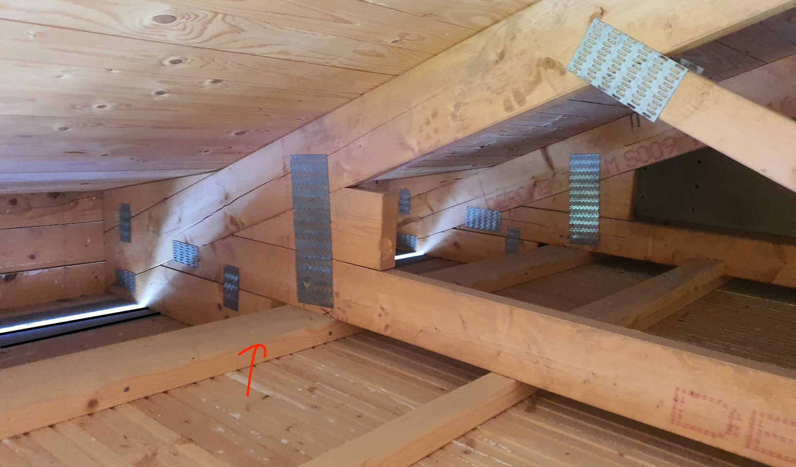 Markerat i svart är ungefär där nya väggen hamnar, röda pilen pekar på nuvarande balk, som kan vara högre för att den ligger på ett annat ställe på takstolen.
