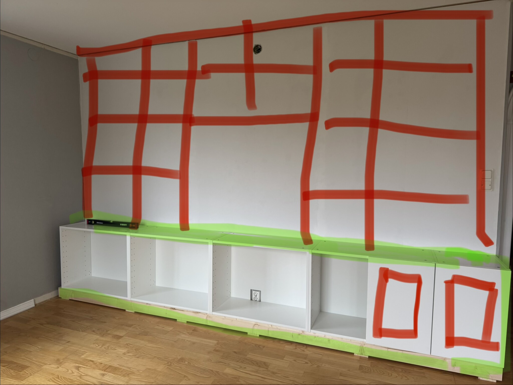Jag håller på att bygga en bokhylla i vardagsrummet. Längst ner har jag IKEAs Metod-stommar på en sockel av 45x95-reglar.
