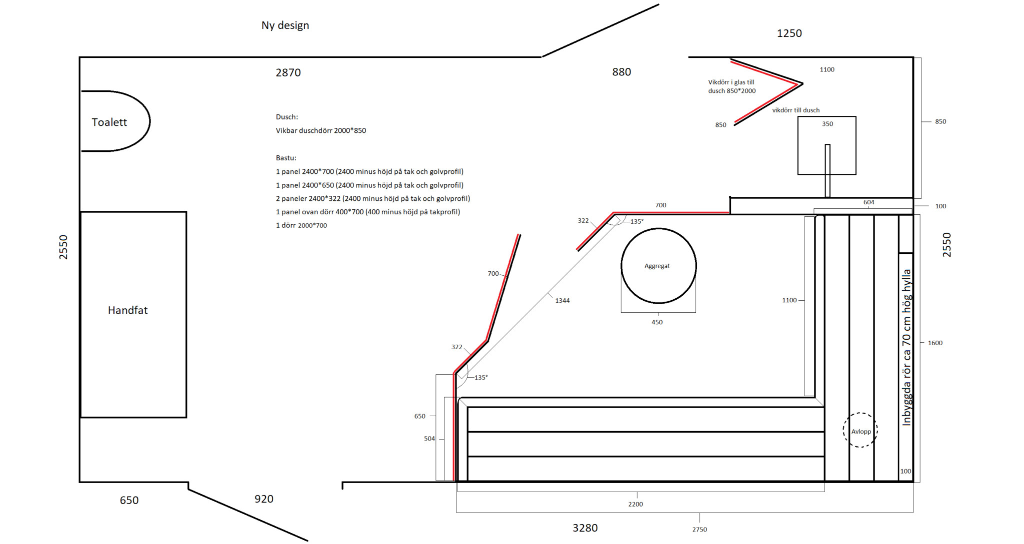 Vi planerar att bygga en duschvägg och en bastu. Avloppet i badrummet är placerat på fel sida från duschen sett. Nu vill vi undvika dubbla tätskikt men vet inte hur vi ska göra. Vi vill inte ha en duschkabin som vi använder oss av idag utan vi vill bygga upp en platta som vi kan klä i klinkers och bygga en vägg med inbyggd dusch och leda vattnet på något sett mot avloppet. Vi vill såklart inte göra om hela badrummet om det går att undvika. Se ritning och ställ gärna frågor om ni inte förstår min fråga.