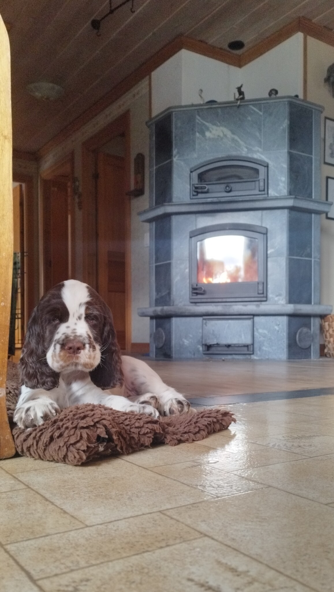 Hunden 9 veckor håller på att lära sig rätta avståndet.
