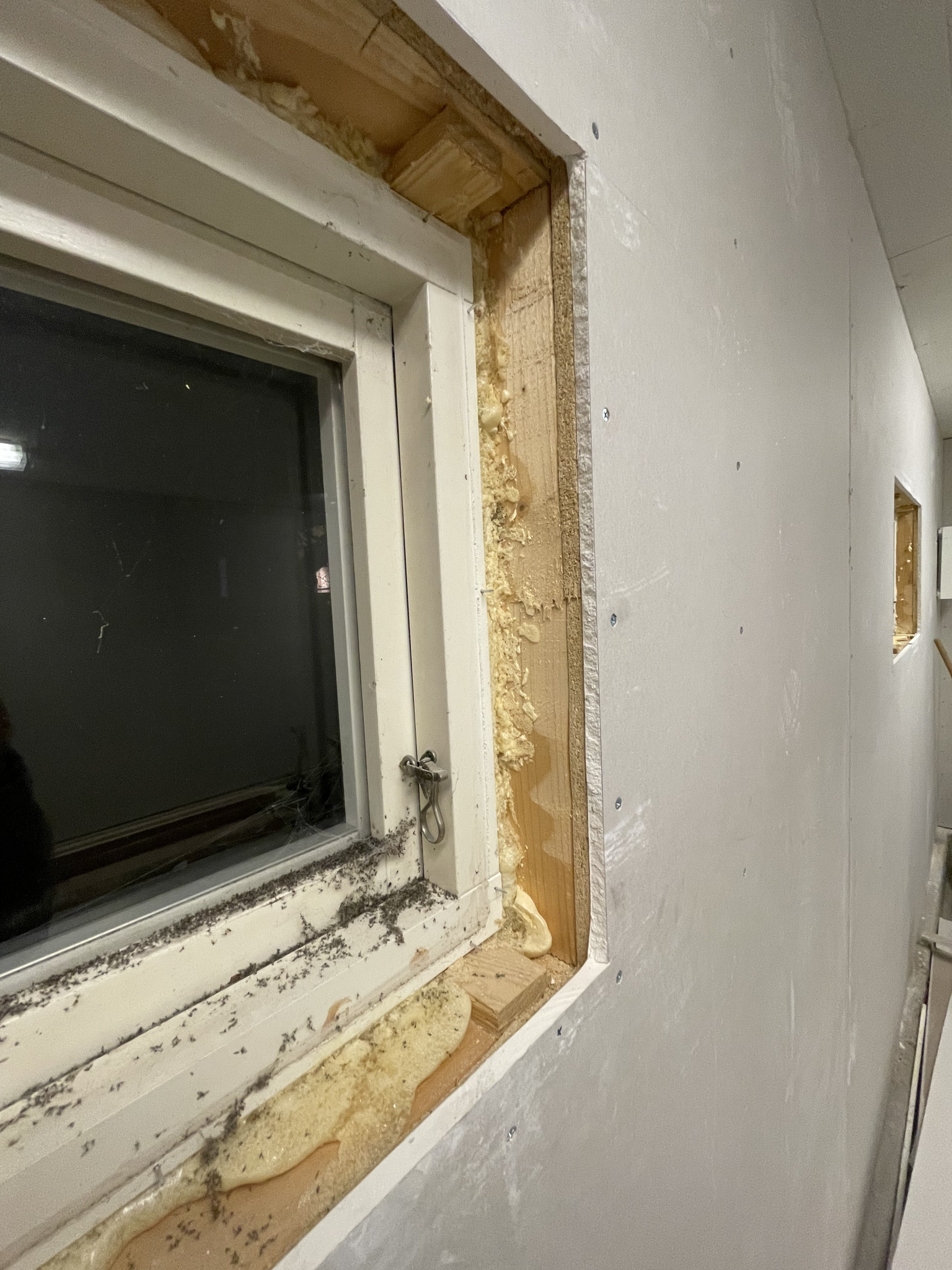 Så här ser det ut nu, avståndet/djupet mellan gips och fönsterkarm varierar mellan 75 och 82 mm.