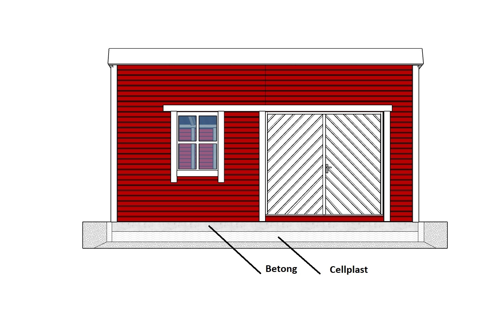 • Sektionsritning av ett förråd som visar lager av betong och cellplast i grunden för att förhindra frost.