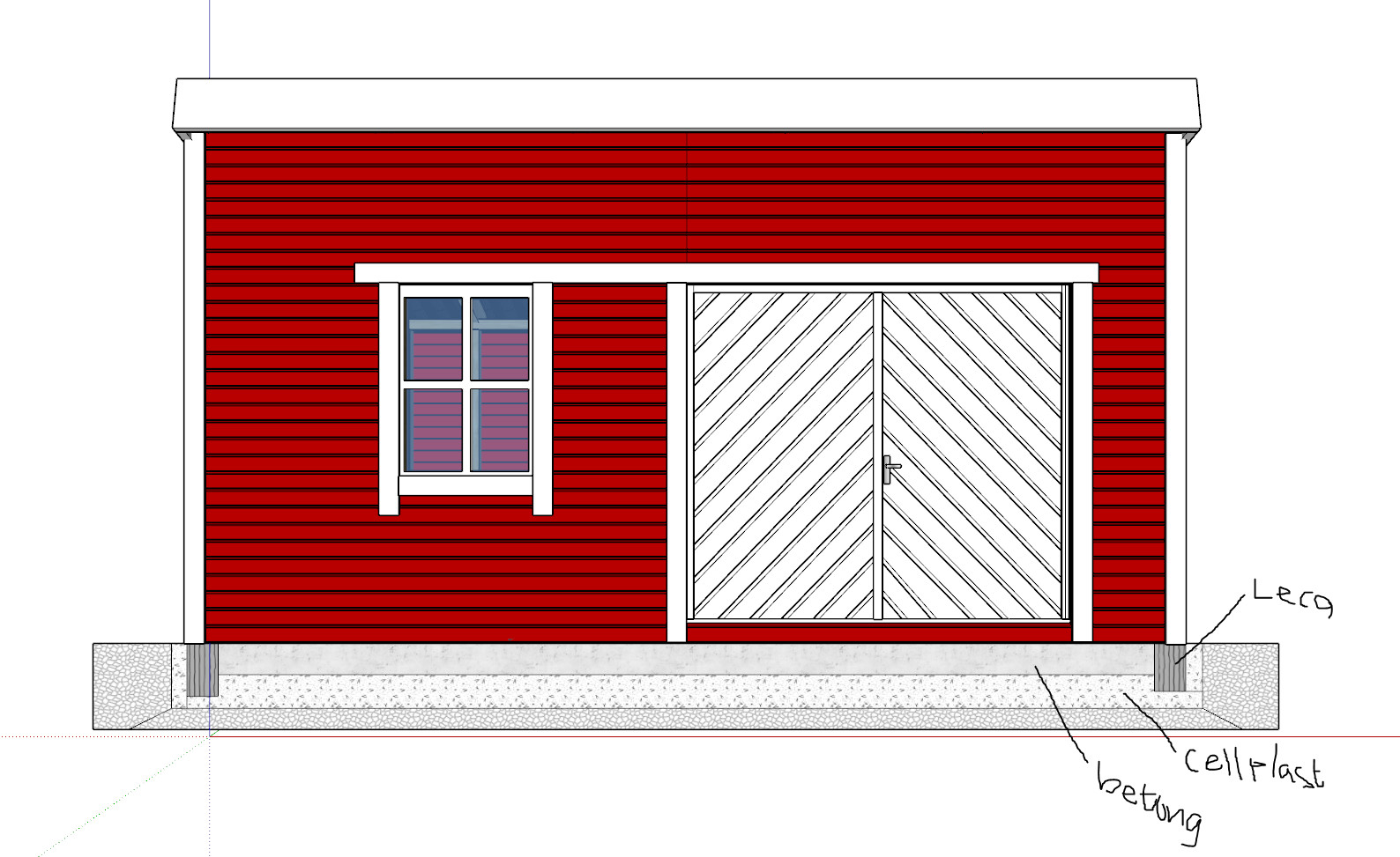 • Ritning av en röd byggnad med vit dörr och ett fönster, markerad med Leca, cellplast och betong.