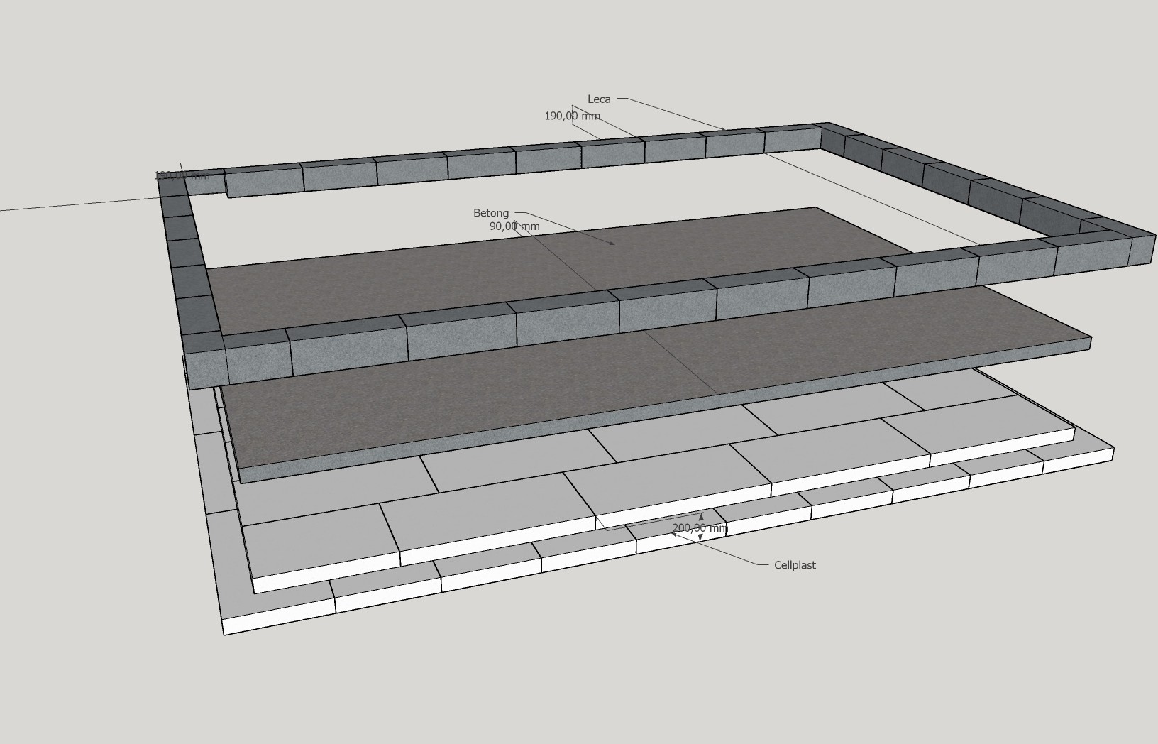 Annars fungerar din lösning ovan bra men jag hade nog skippat lecablocken och gjutit mot en form av virke istället. Sen kan du limma på cellplast på sidorna av din platta och utanpå detta limma/skruva t.ex. byggmax fibercementskivor avsedda som trossbottenskivor. Då får du en bättre isolerad och troligen billigare lösning än det du ritat.