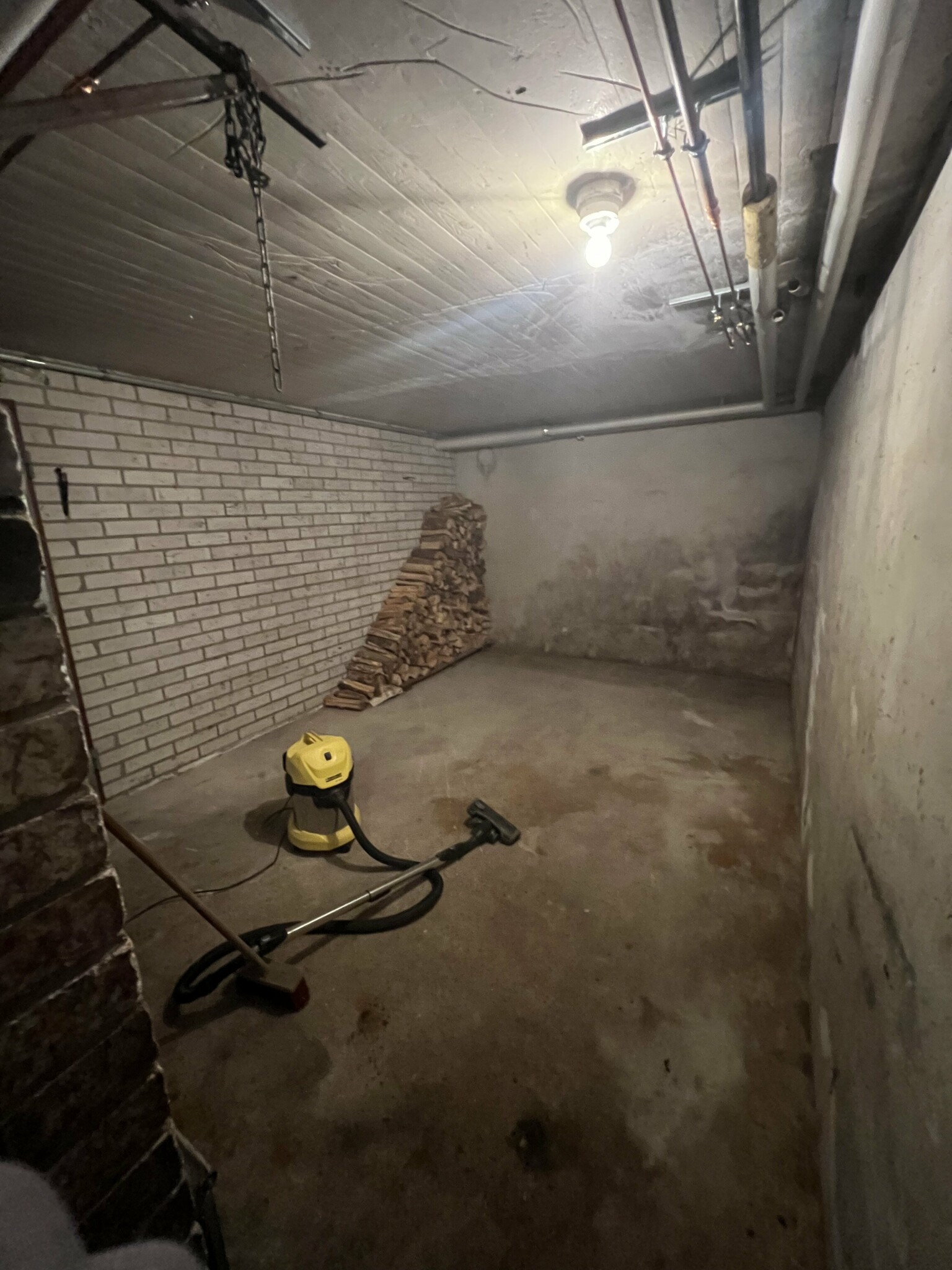De första jag skulle gjort är att åka till jula å köpa 2-3 st led armaturer för typ 199 st , sen borsta pust väggarna ordentligt , kolla vid fuktskadan om putsen blivit dålig , ta en hammare å knacka lätt å se om de är boom , sen målat 2 gånger med silikat färg , behålla tegel , måla golvet med en källar färg, typ grå ,