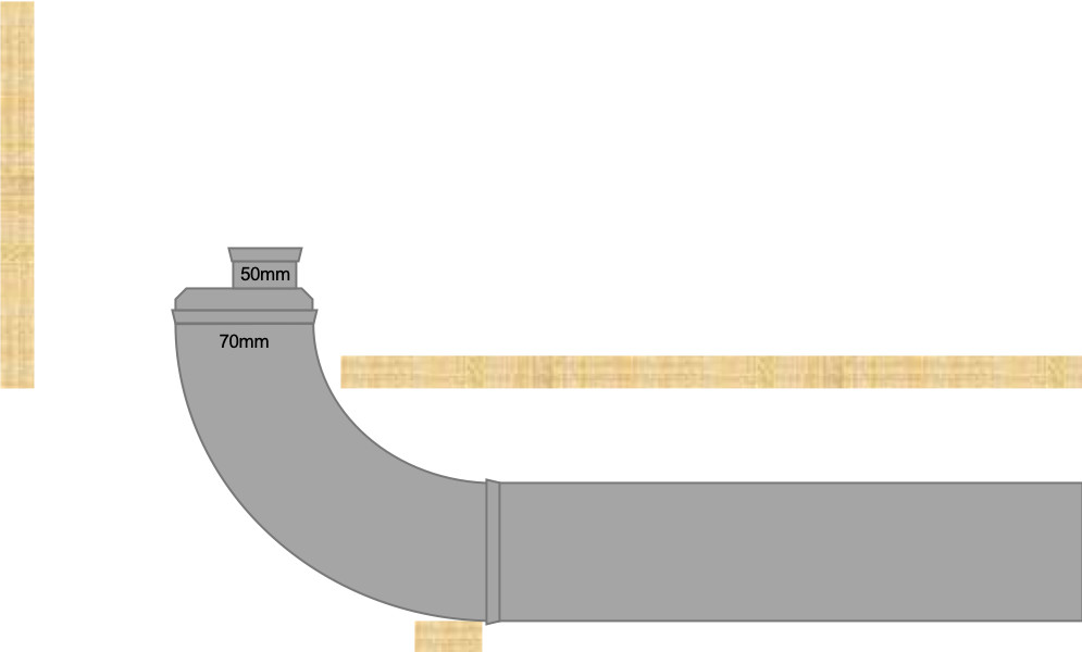 Avloppet som kommer upp ur golvet är en 70mm(!) 90º-böj. För att spara utrymme skulle vi helst vilja få ner avloppet under golvnivå för att slippa behöva bygga in det i skåpet/väggen.
