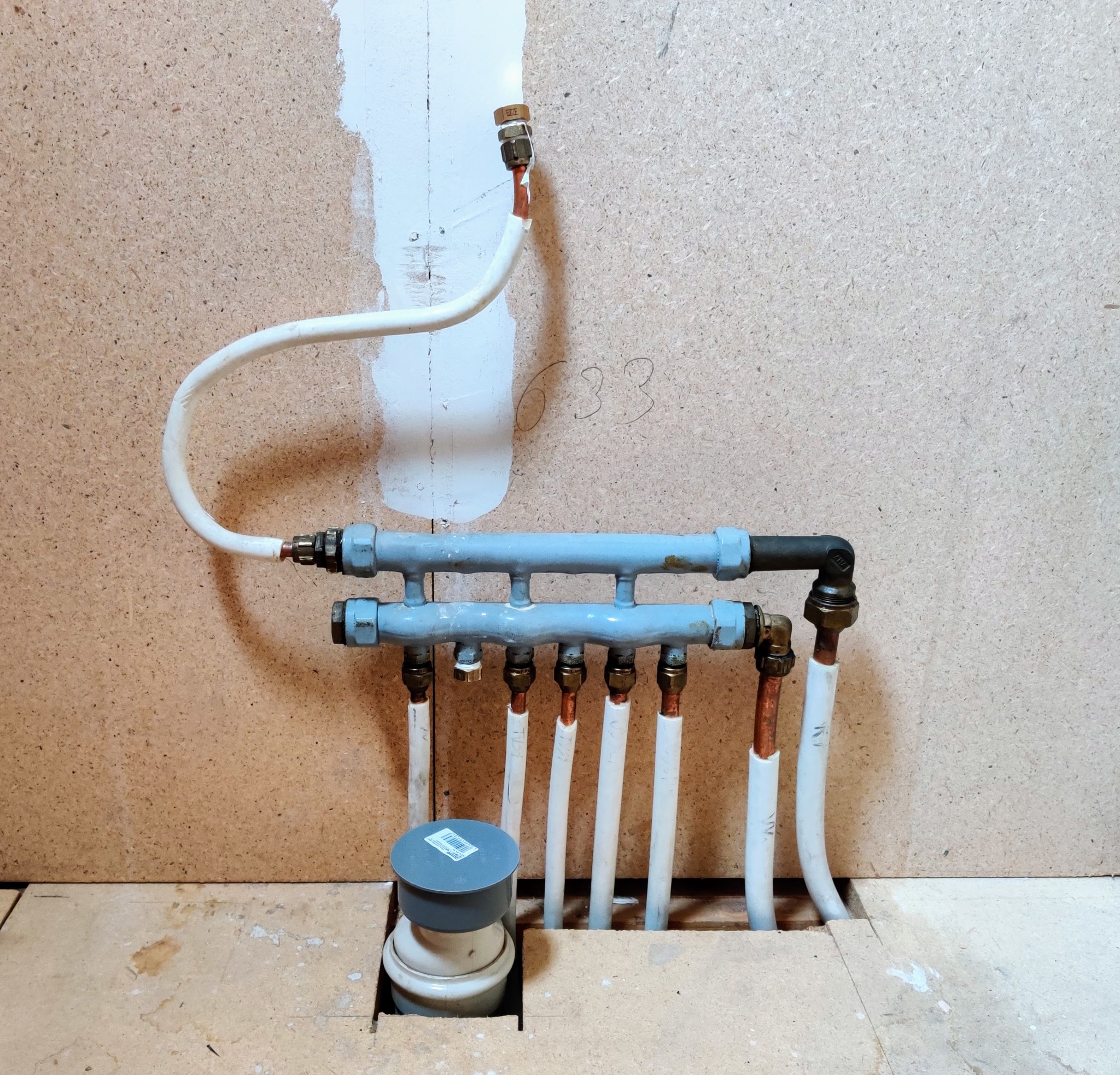 På övervåningen i huset, byggt -74, håller vi på att konvertera ett pentry till ett "vanligt" rum. Där diskbänken satt finns det förutom avlopp också en fördelare för tappvatten som förser badrummet på andra sidan våningsplanet med vatten.