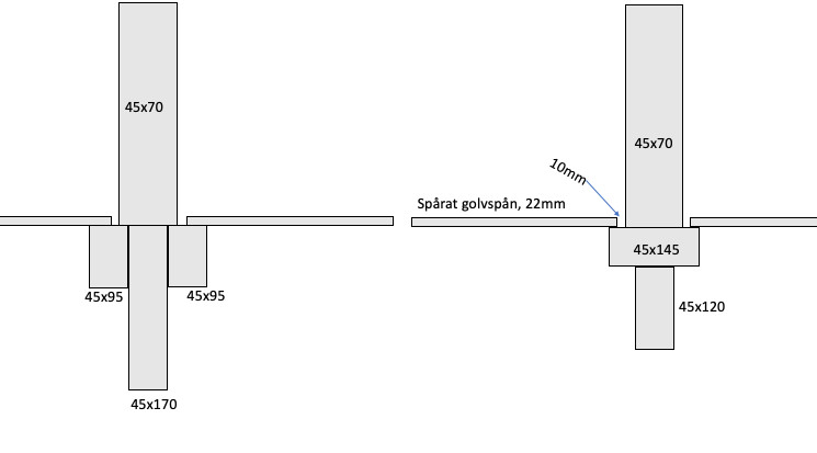 1. Ny 45x170 regel som jag fäster syllen på på ovansidan, sen sätter jag en regel på varje sida som golvspånet kan vila på (se förslag nedan)