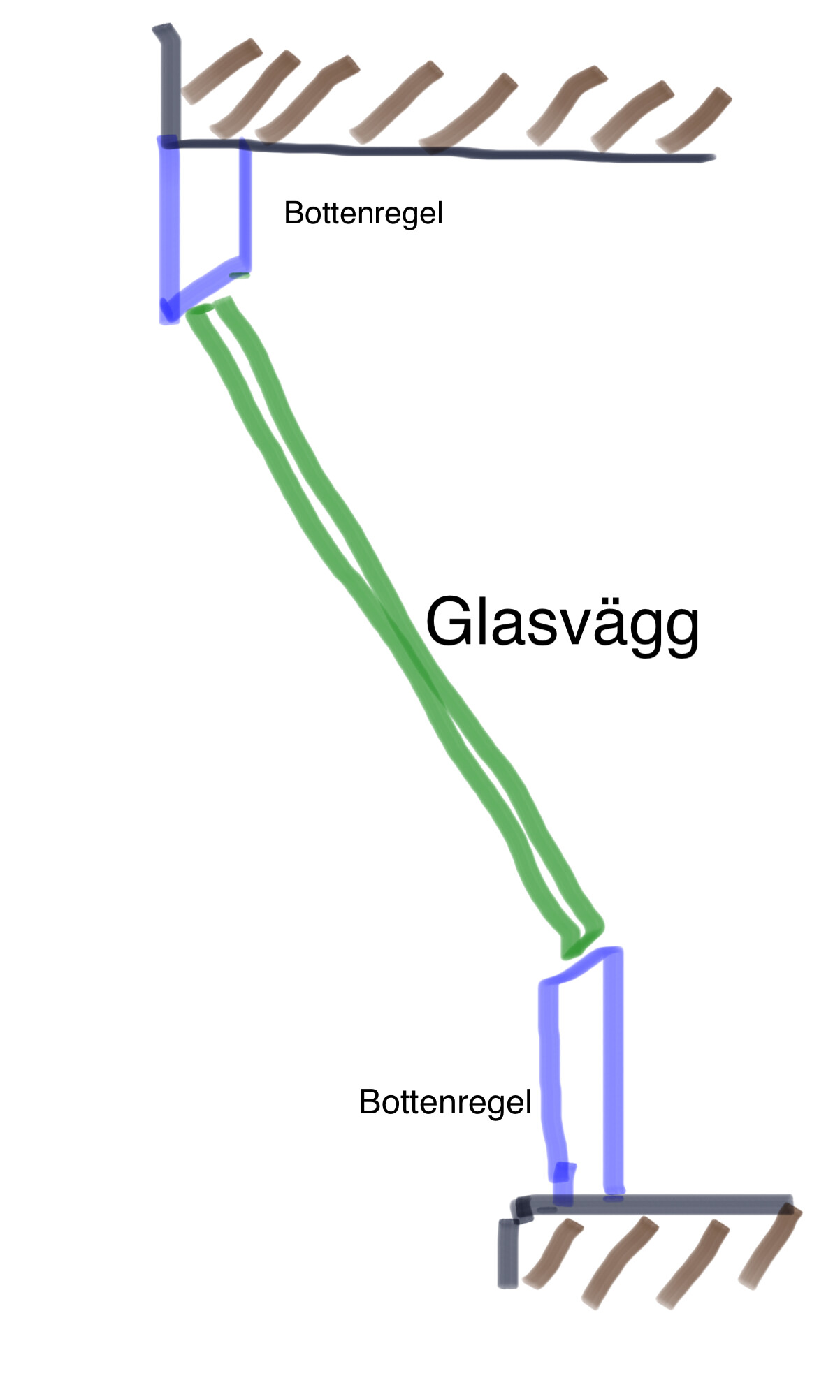 Själva glasväggen är snedställd i vinkel mellan de två korta innerväggarna jag bygger och de löper parallellt i förh till varandra med en offset på ca 1m. Se bild.