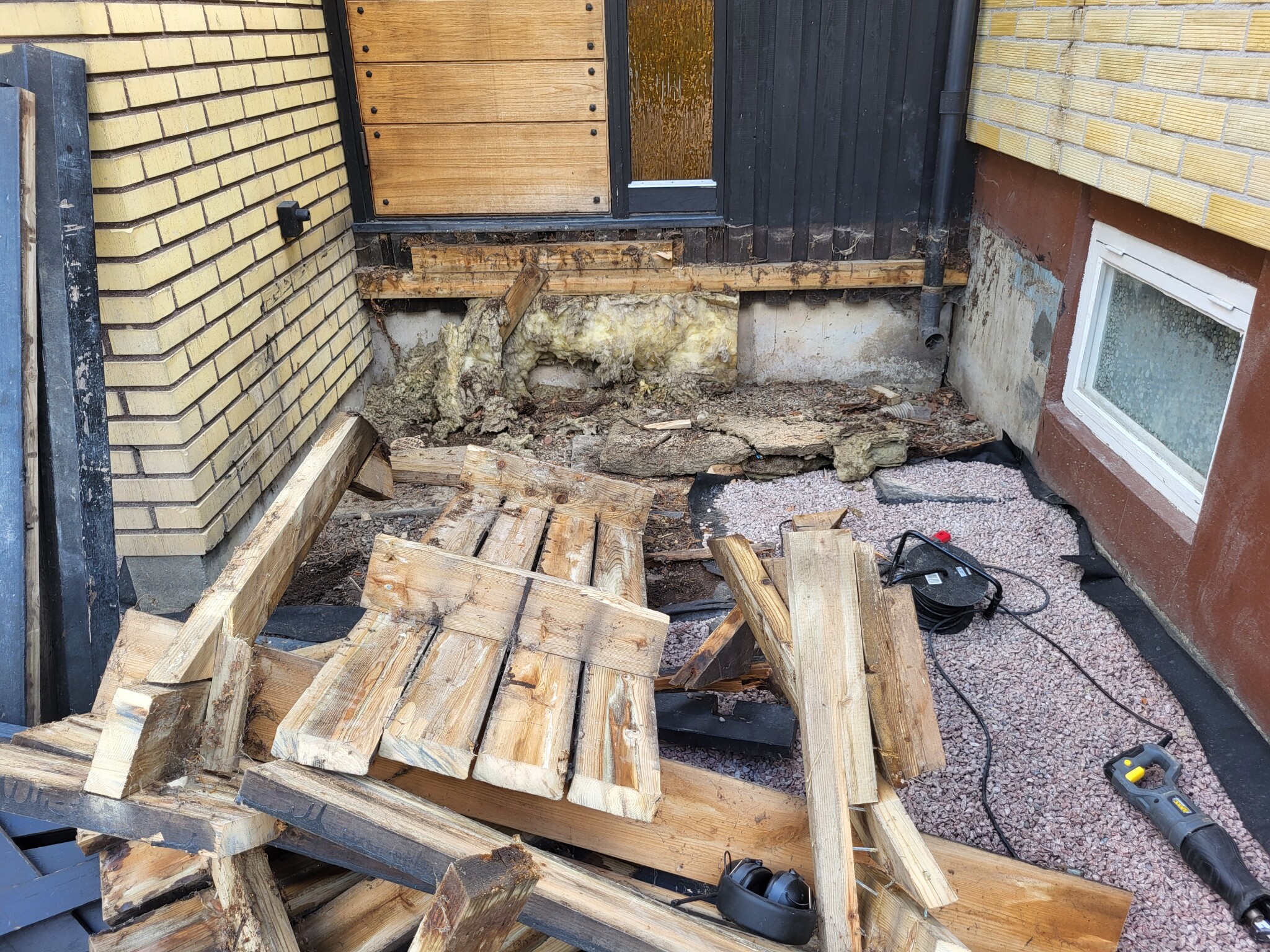 Jag tänkte bygga en ny yttertrappa då den gamla från slutet av 70-talet var slut, måtten är höjd 77 cm bredd 147 cm och min idé efter att ha googlat lite är att sätta en bärlina mot träfasaden som jag drar fast med träskruv, dra fast 3 vagnsstycken med vinkeljärn eller balkskor, lägga nedre delen på antingen plattor eller i grus.
