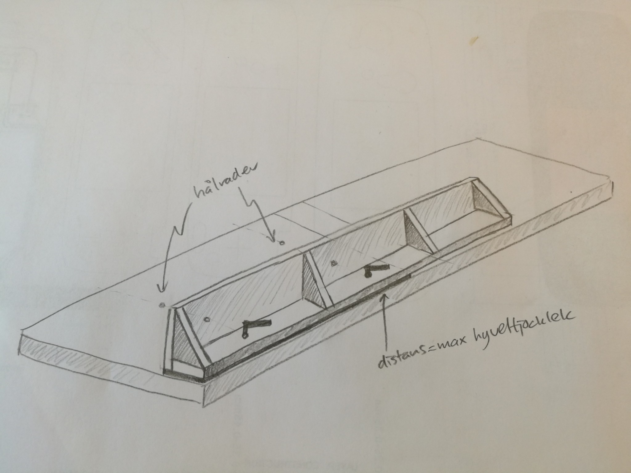 Ett förslag. Hålen genom skivan är för gängstång ner i befintliga fästhål, förslagsvis vingmuttrar fastpinnade i ändarna på gängstängerna för att enkelt kunna plocka bort anhållet när borden ska vickas. Bitarna på baksidan är för att det inte ska slå sig, förslagsvis i plywood för formstarkare konstruktion. Måtten är förslag.