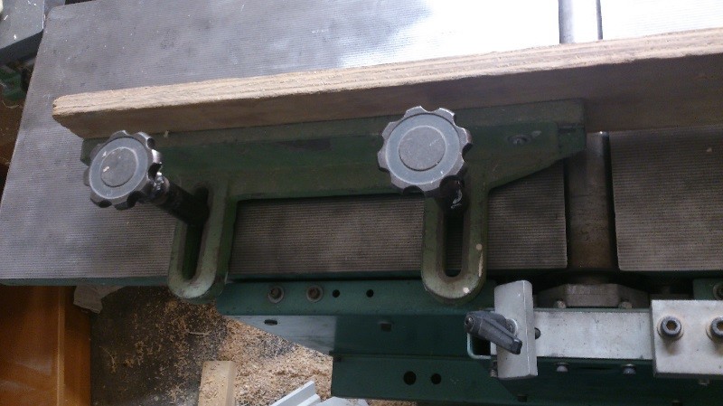 Edit. Så här hade jag gjort o funderar att göra på min egen hyvel. Fast när jag tänker efter hade jag nog satt anhållet i utmatningsbordet för att slippa distansen. Nackdelen med denna lösning är att du inte kan utnyttja hela kutterbredden.