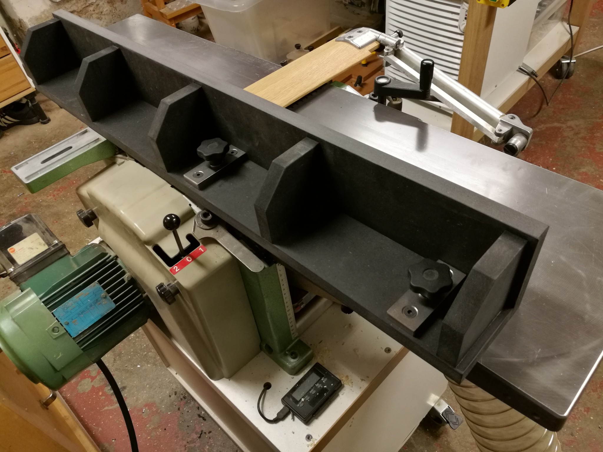 OT: Jag ser att många har sina (mindre) hyvlar på någon form av kabinettskåp. Idag har jag en Luna Proofy-historia som står på stålben bredare än maskinens bas.