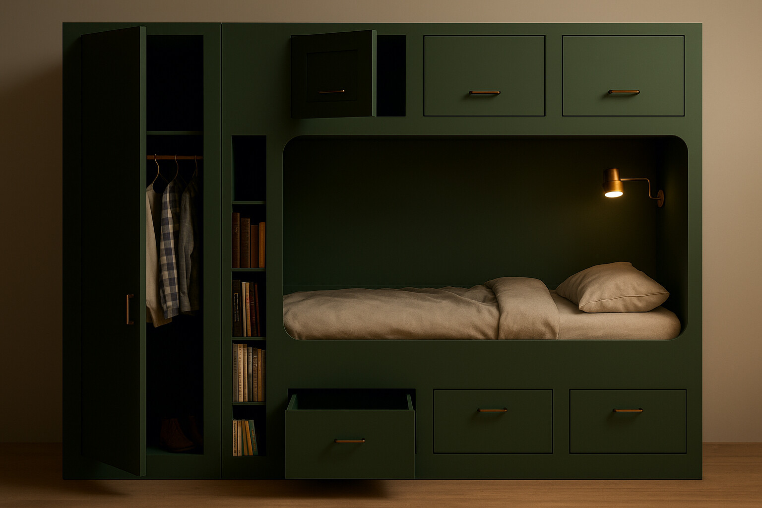 Jag skulle dock vända på bäddningen. Bokhyllan behöver inte vara lika djup som garderoben (inte ens garderober brukar vara 90cm djupa). Utrymmet bakom bokhyllan blir då en bra sänghylla. Och fortare än du önskar kommer det behövas uttag för laddare där.