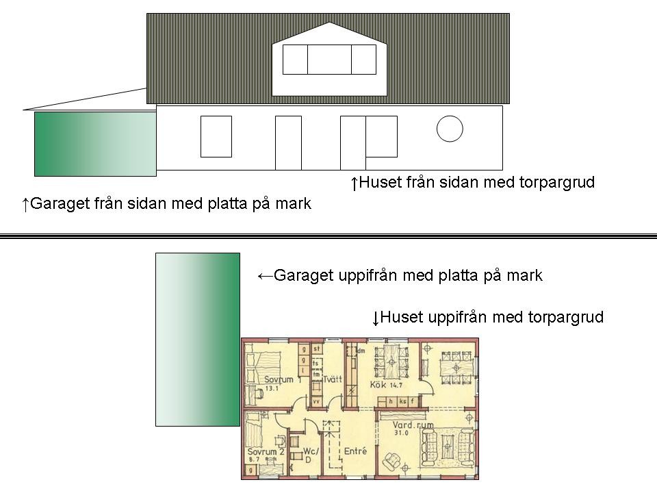 Jag skall bygga Smålandsvillans hus Villa Västervik som är ett 1,5-plans hus som byggs på torpargrund. Pga tomtens beskaffenhet så måste jag bygga garaget mot huset och jag har då vissa funderingar att två olika grundsystem, husets torpagrund samt garagets platta på mark, som kommer att ligga mot varandra (se bifogad bild). Mina frågor är följande: