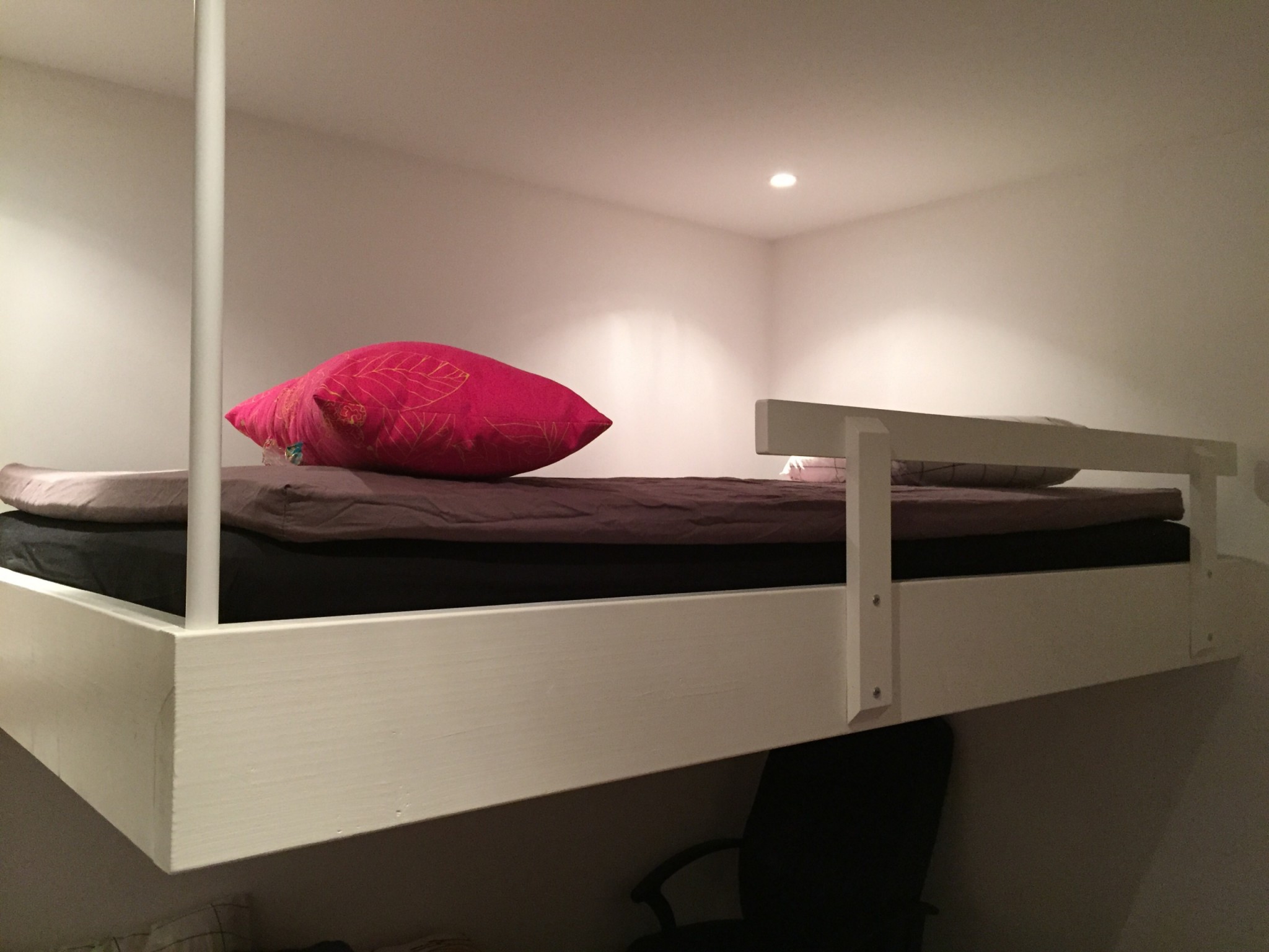 Du skulle ju kunna "fälla in" sänbotten i loftet, sängen behöver ju inte stå på något, då sparar du höjd och främre regeln kan vara 45x170 eller 45x195 utan att det minskar användbar höjd.Dajo321 skrev: