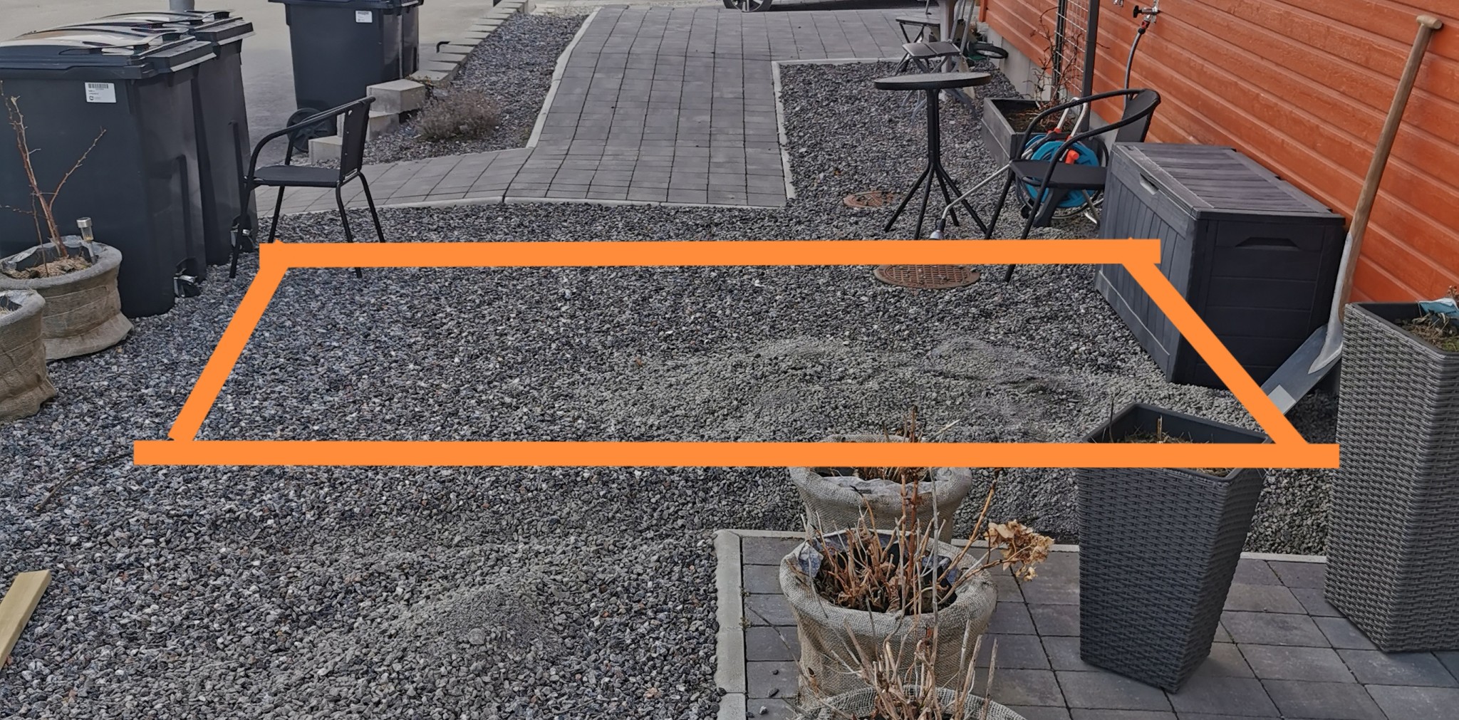 På framsidan av mitt parhus finns ett område med grus/singel och där planerar jag att bygga ett fristående trädäck av trall.