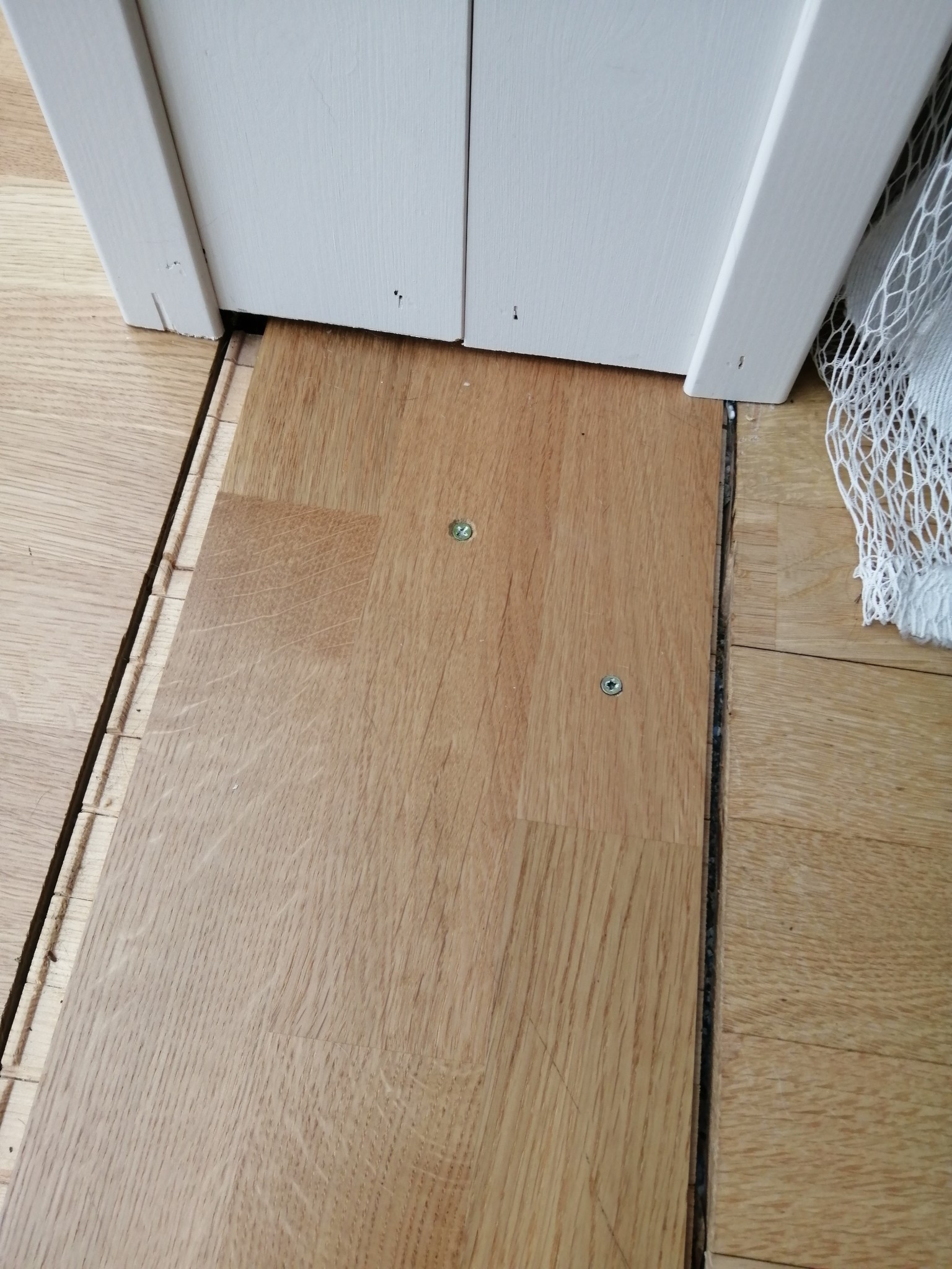 En tanke vi haft är att lägga en trestavsparkettgolvbräda i glappet och sedan sättq lister i/över skarvarna? För en sådan liten höjdskillnad, även att den varierar, bör inte vara något problem för en golvlist, eller hur? Golvbrädorna är förresten drygt 20cm breda. Just nu har jag lagt golvbräda där, mest för att ha en tillsvidarelösning, så de är fastskruvade. Men kanske bör det bli en permanent lösning?