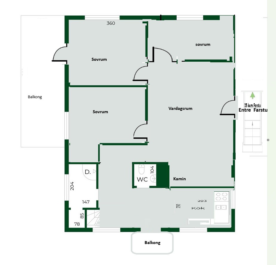 En idé, lägg farstun till höger om huset, hänga ihop med bakre tillbyggnaden. Gör köket till sovrum och gör kök + vardagsrum av mittdelen i huset, där det står rum och rum i nuvarande. Nuvarande entré blir bara för finbesök, kräver inte så mycket plats