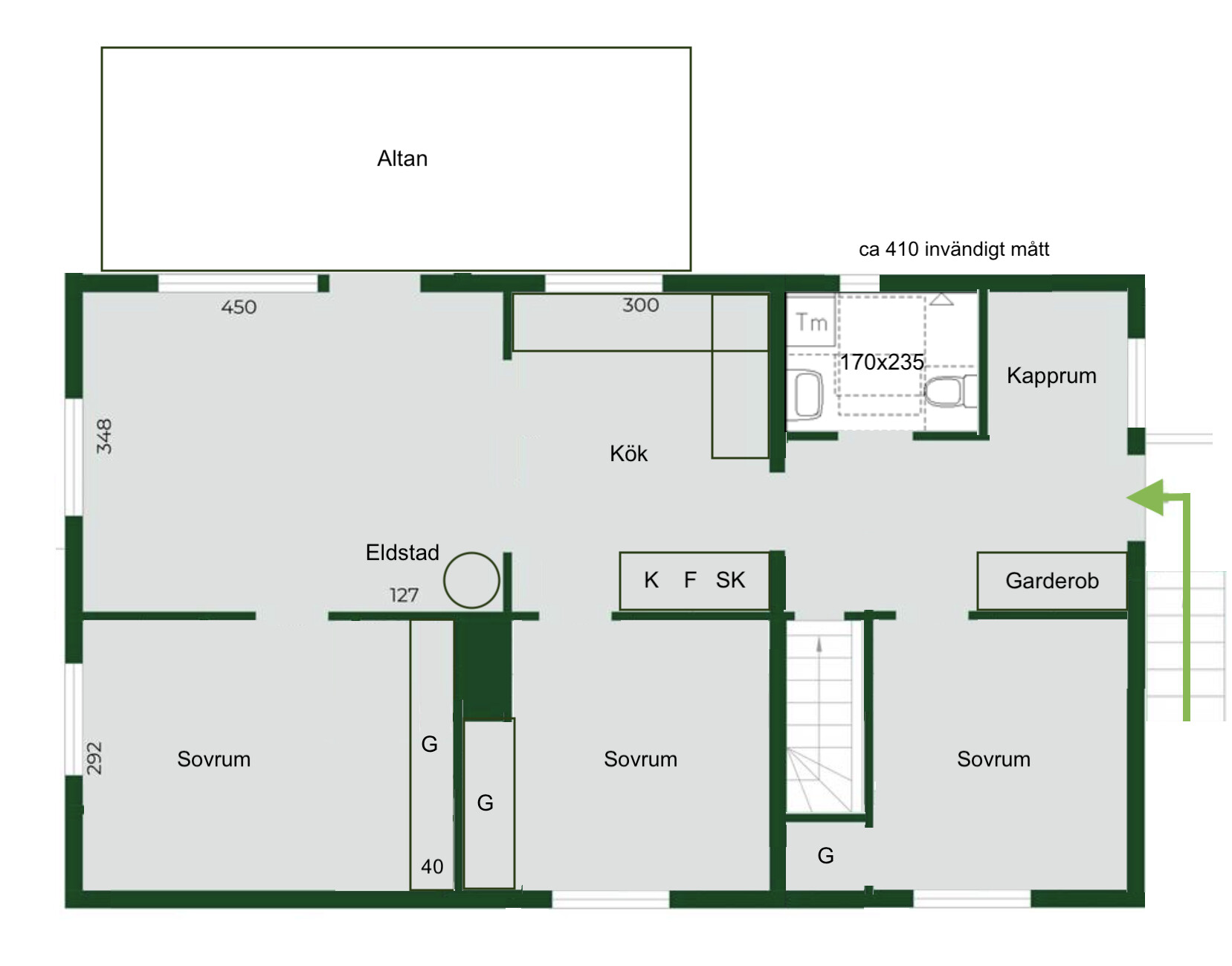 Entrén jag tänkte är upp för trappan där du ritat och in i en nybyggd farstu. Till vänster går man i huset. Rakt fram fortsätter farstun till bakre väggen med garderober längs sidan, eller båda sidor om man vill. Då blir farstun/entrén en del av tillbyggnaden baktill.