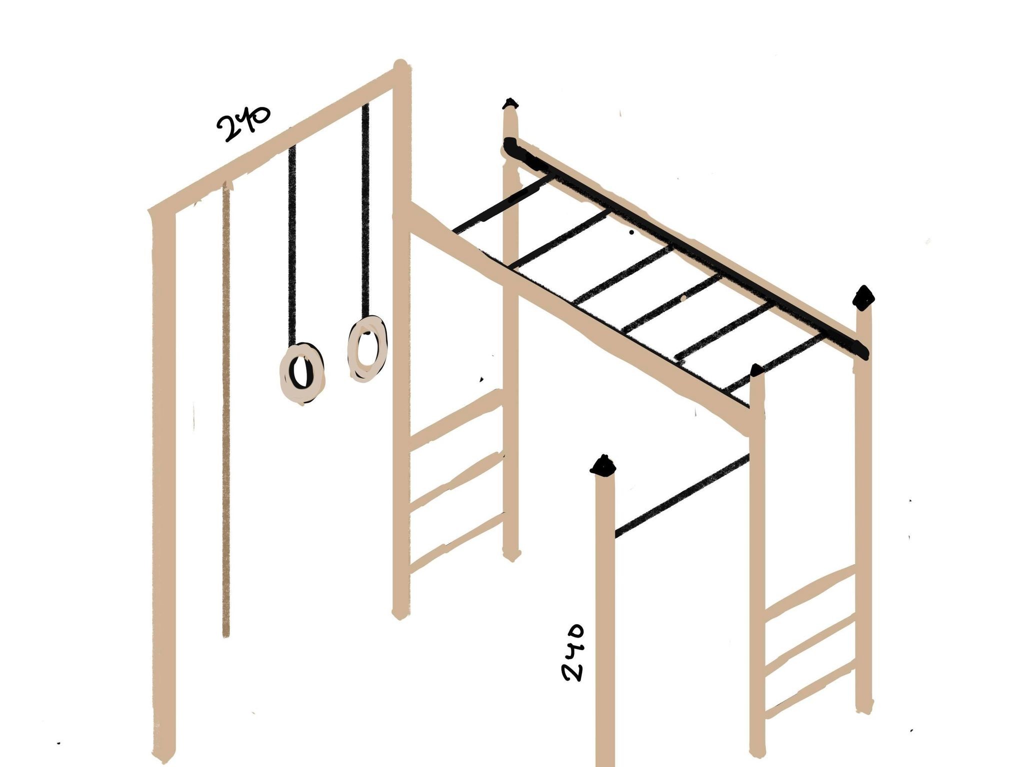Jag har en ritning på hur jag har tänkt att utegymmet ska se ut, men jag vet inte om det blir en stabil struktur - därför tar jag gärna emot tips och råd på förbättringar av ritningen.