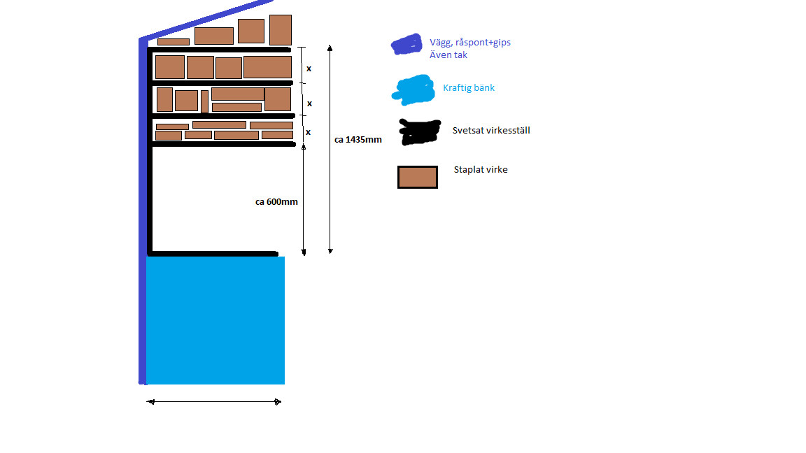 Ska bygge virkeställ ovanpå en del av sågbänken till min kapsåg. Ska svetsa 8 st konsoller (över ca 7m). Dessa ska jag skruva i sågbänken under (den håller, mycket kraftig) samt skruva i väggen bakom (råspont, 1-1,5" gissar jag). Jag hade inte tänkt förbinda konsolerna med varandra.