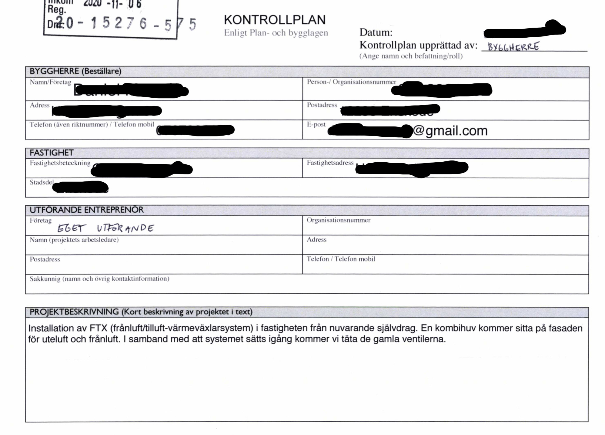 Är det någon som gjort en bygganmälan på sitt hembyggda FTX system som fått det godkänt? Då är jag väldigt nyfiken på vad som skickades in i form av ritningar, beskrivningar, kontrollplan osv? Sitter med detta nu (från självdrag) och undrar vad som egentligen behövs.