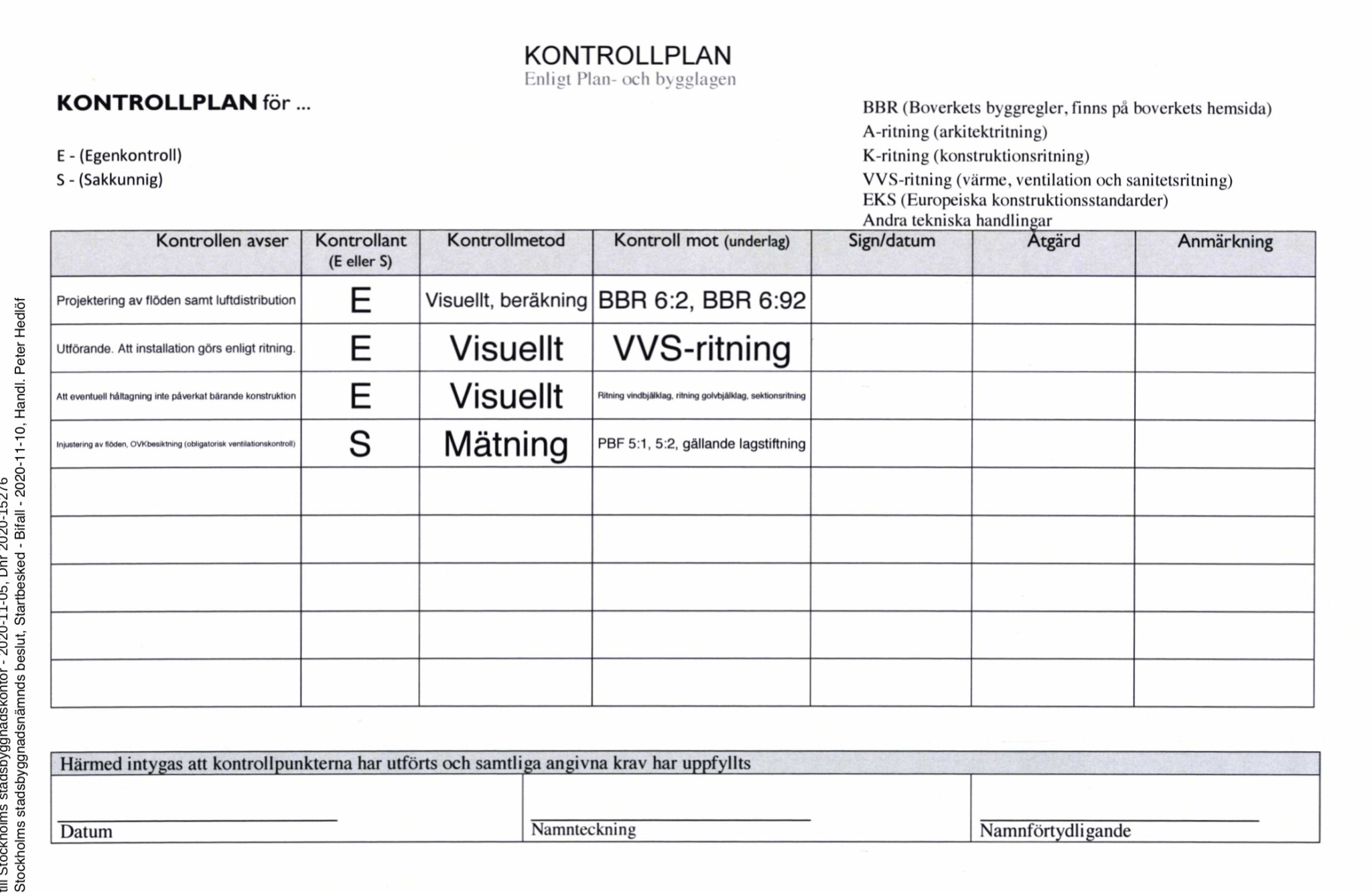 Hej, Jag gjorde liknade kontrollplan och riktning som du och fick jag också startbeske. FTX installation är på gång nu. Fick från kommun att jag ska lämna in såna dokument att få slutbesked.1. Signerad och ifylld kontrollplan för slutbesked