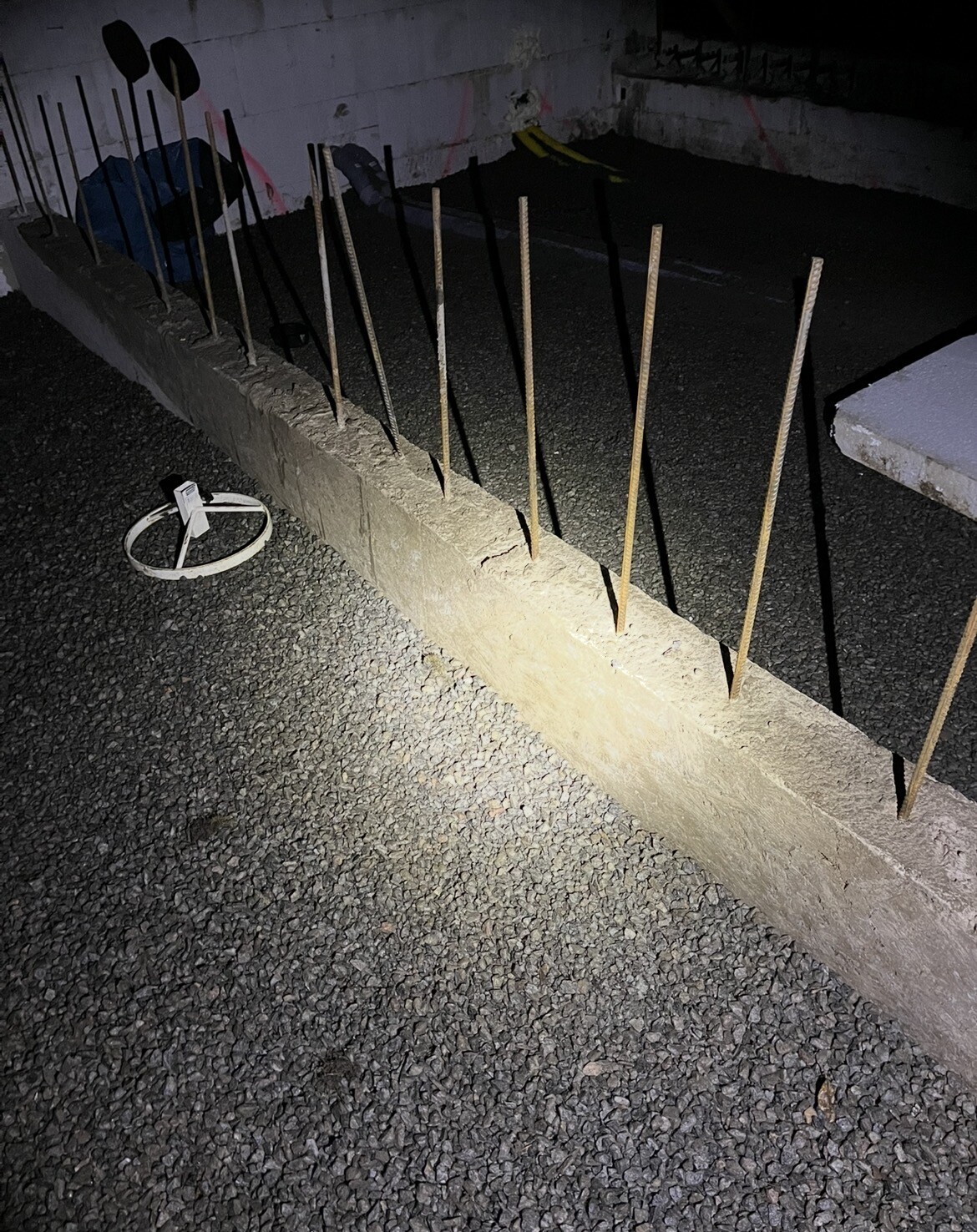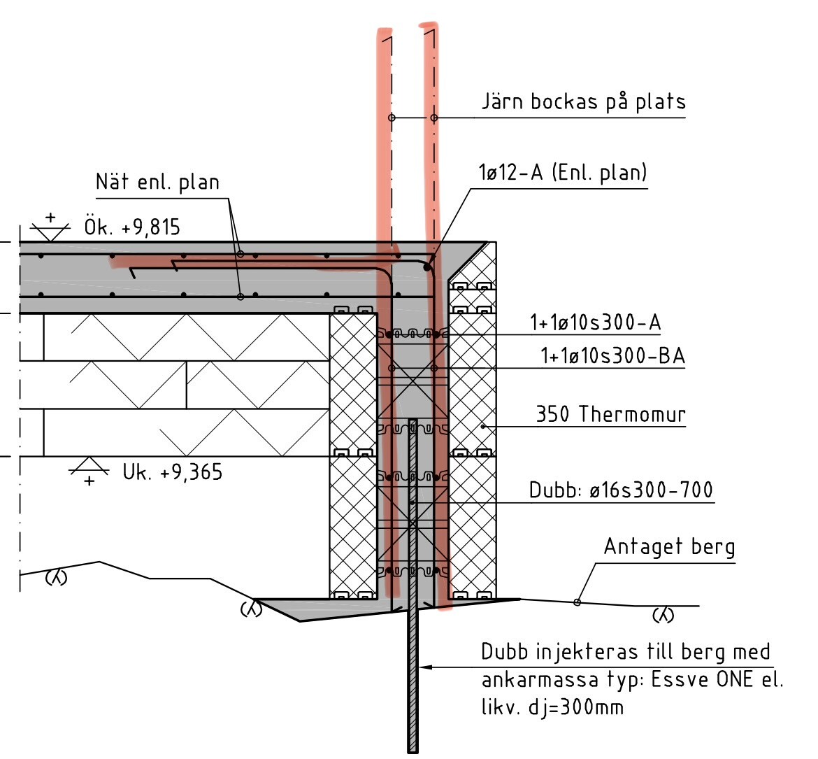 När byggarna har gjutit muren så har de inte följt K-ritningen för de 12 mm järn som ska sticka upp ur muren och sedan bockas ner (se ritning, rödmarkerade). Cc ska vara 300 men de har ökat till ca 600. Även stödmurar under plattan ska ha samma uppsticksarmering men där har de nöjt sig med enkla järn istället för dubbla och även där cc ca 600