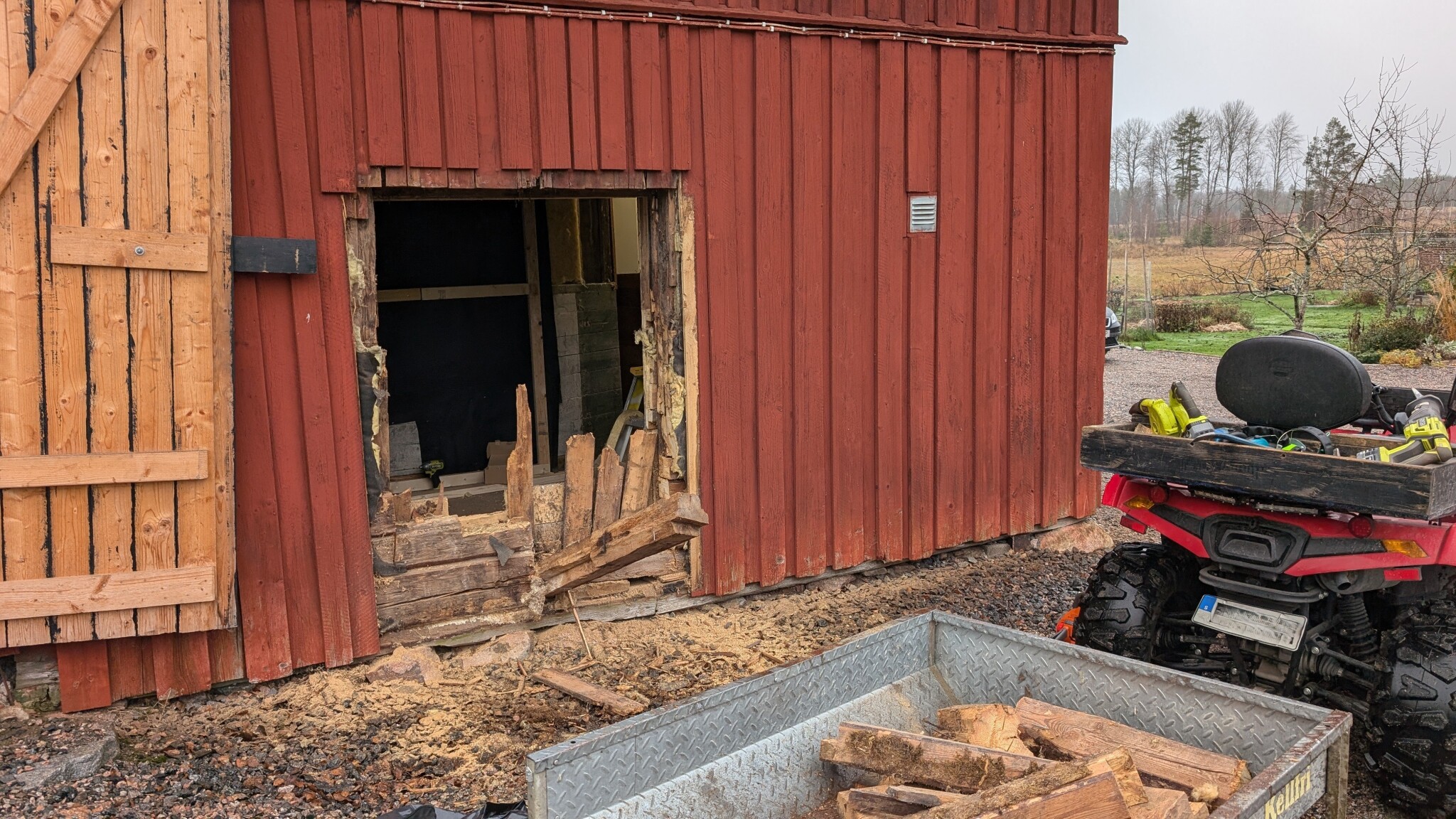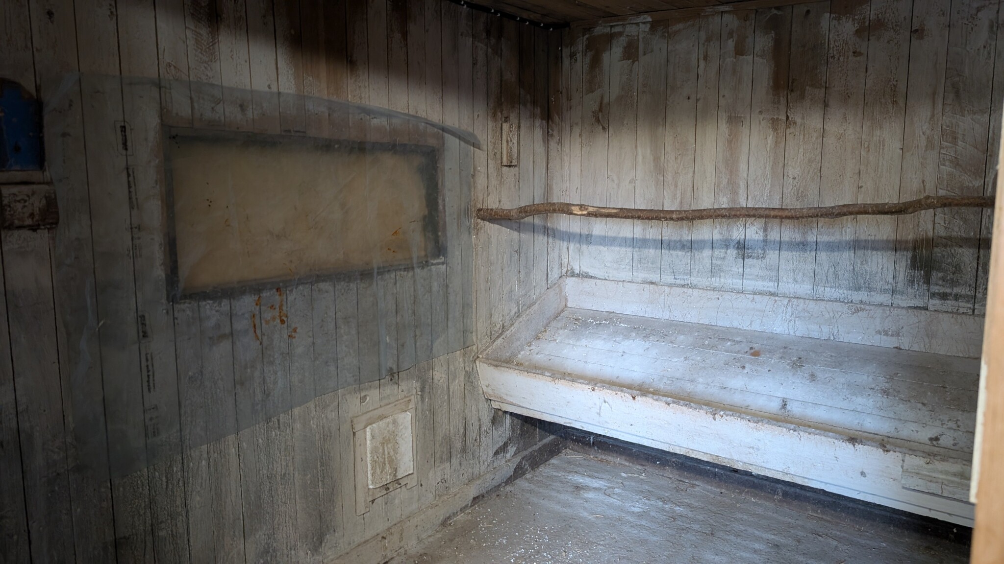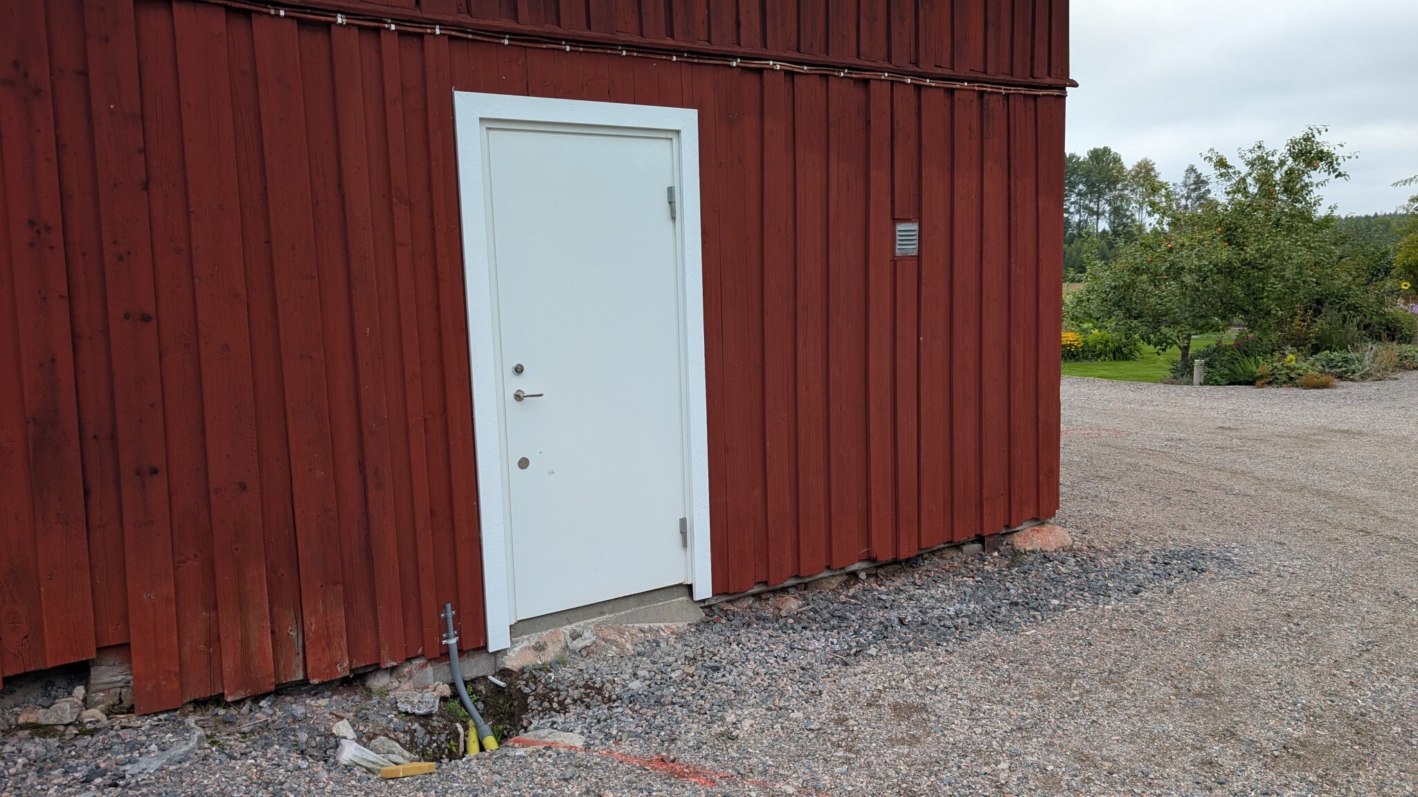 För att göra det bästa möjliga för brandsäkerheten byggde jag en ny vägg där hästboxdörren stod (där jag har ryggen emot när jag tog fotot) och öppnade upp en dörr där fönstret satt. Vid en brand skulle det bli lättare för brandkåren att komma åt rummet snabbt.
