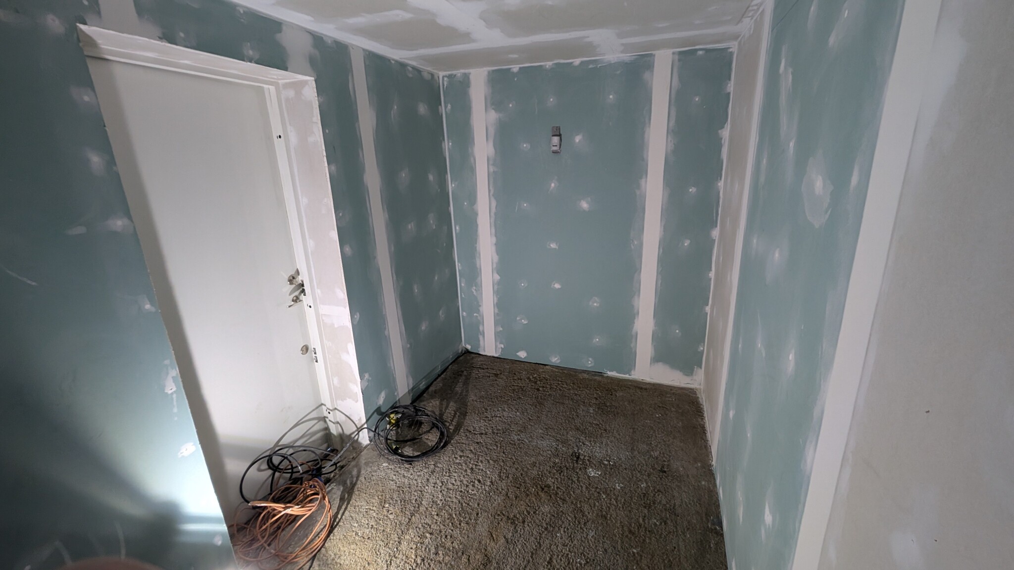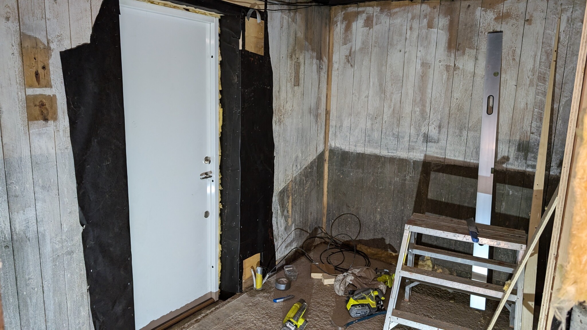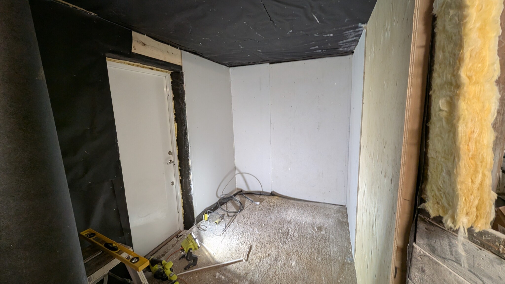 När plåtdörren var på plats och reglarna var uppe runt den, började jobbet med att isolera och sätta upp gipsskivor.