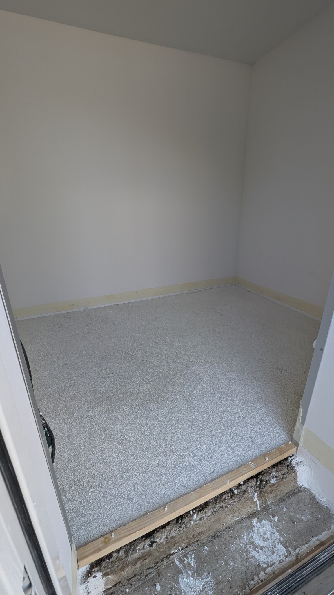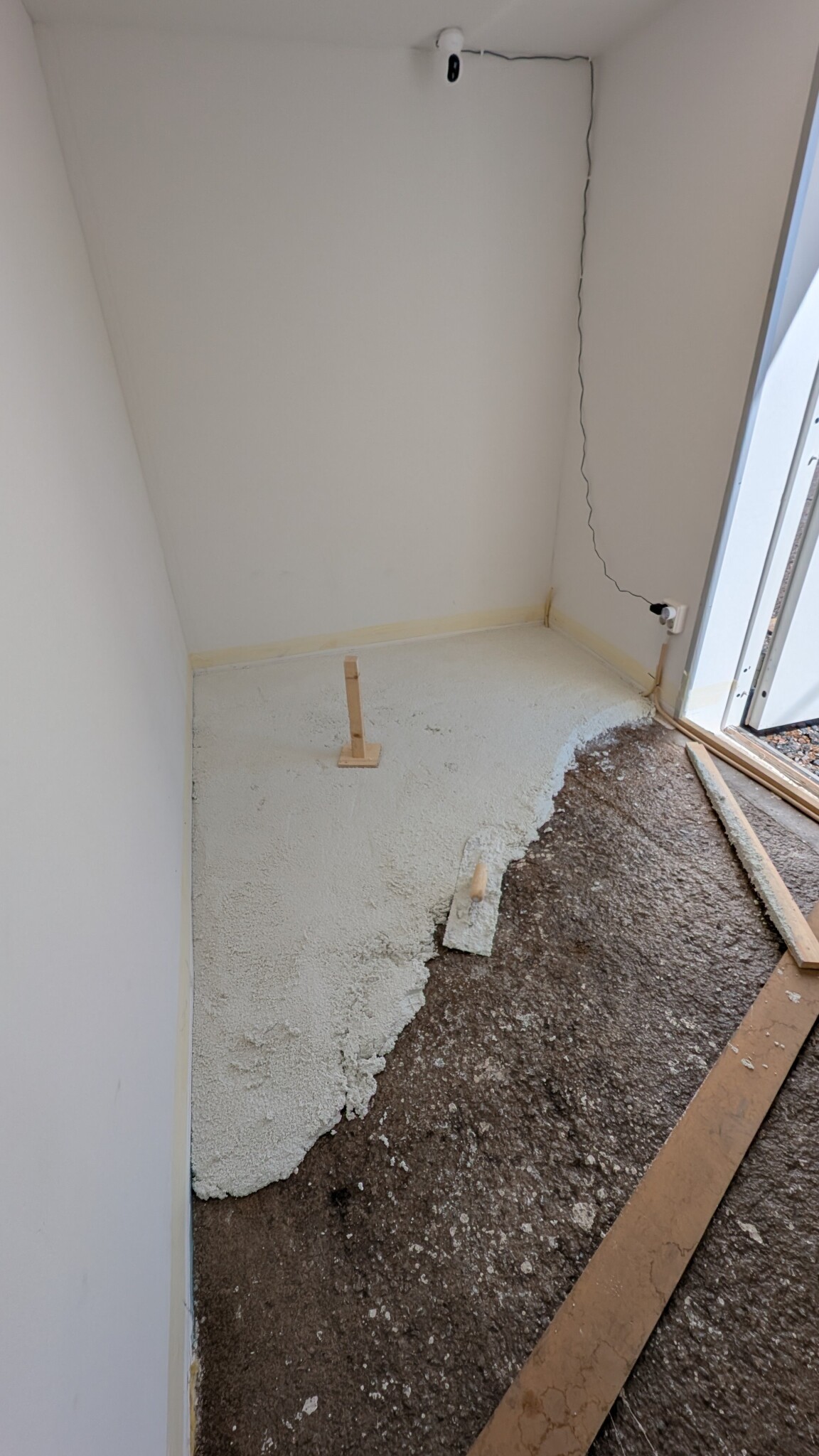 När rummet var målat och klart kom det en överraskning som jag inte hade kollat upp: Golvet lutade cirka 10 cm från en sida till den andra. Eftersom jag ville ha golvet i våg la jag EPS-betong över primat golv och vägde av det med laser för att ge en grund inför flytspackling med elgolvvärme. EPS-betong är som cement blandat med frigolitkulor och har isolerande egenskaper.