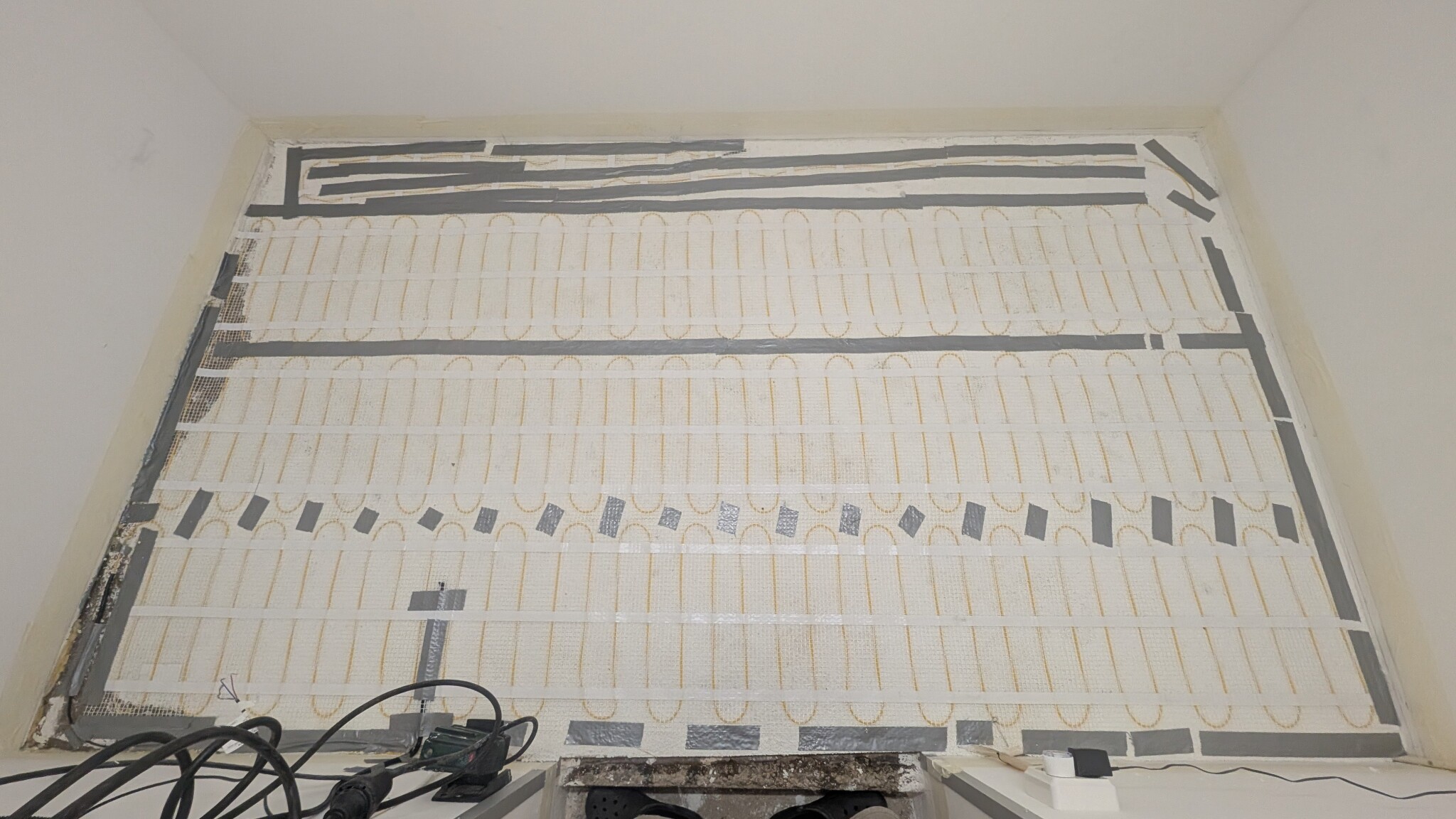 Jag primade och monterade fast elslingorna innan flyspackling. Det finns säkert synpunkter på att man kunde ha ett litet element istället eller att batterierna alstrar tillräckligt med värme. Av erfarenhet vet jag att om man snålar eller väljer att avstå från något för att spara tid kan man ångra sig i efterhand, när man inte kan göra något åt det. I det här fallet var extrakostnaden och arbetstiden värd det, för att slippa element som tar plats och få värme underifrån för att undvika att batteriet kan frysa underifrån. Nu vet jag att mina batterier alstrar värme och än så länge har jag inte behövt använda golvvärmen. Möjligt att det kan behövas om det är extremt kallt under en längre period, men än så länge har det inte varit det. Cementgolvet som jag la över golvvärmen var extremt dyrt, cirka 5 000 kr, och är ett golv man har på industrier där fordon som truckar kör.