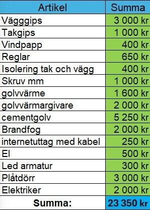 Så här såg kostnaderna ut för mig för att få brandcellen klar. Jag gjorde allt själv utom elskåpet med säkringarna.