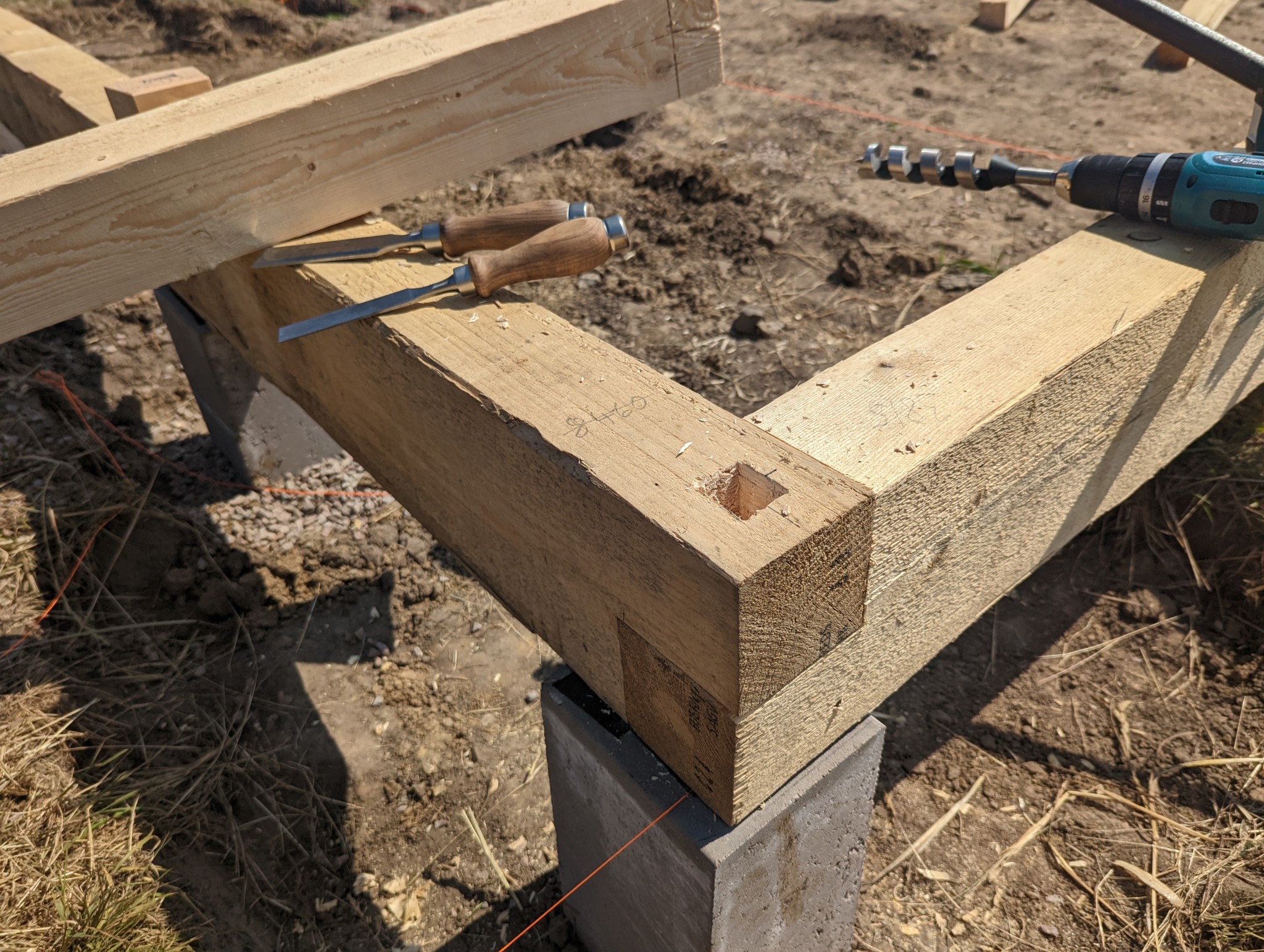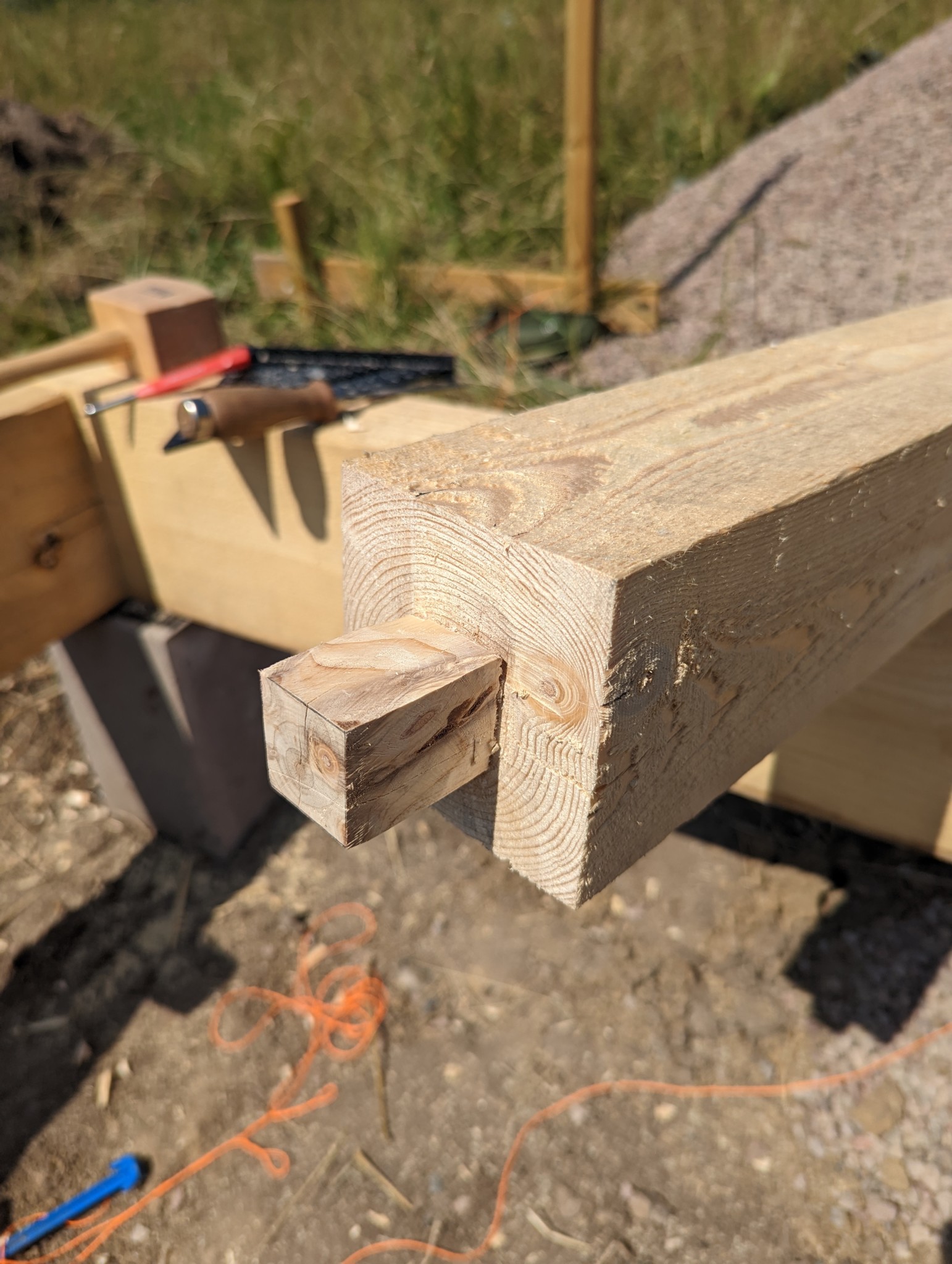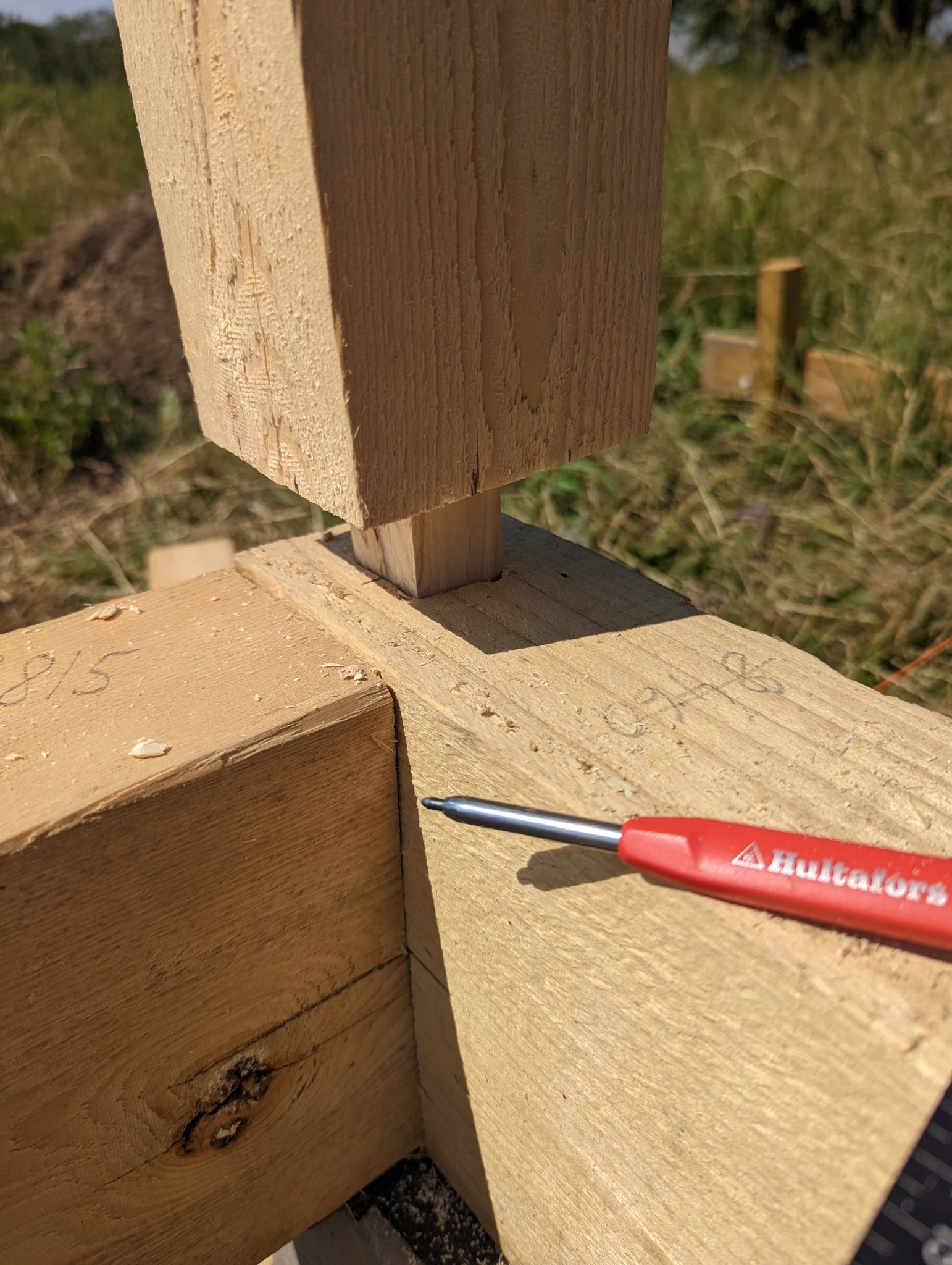 Tapparna fästs med dymlingar, stora träplugg som går genom tapp och bjälke, de görs med förskjutning så att de spänner ihop virket. Jag är rädd att mina tappar är lite korta för att fästas så, så det blir kanske en konstruktuonsskruv där med.