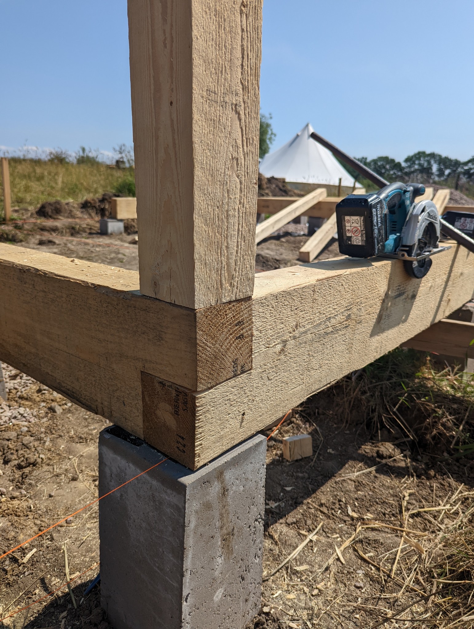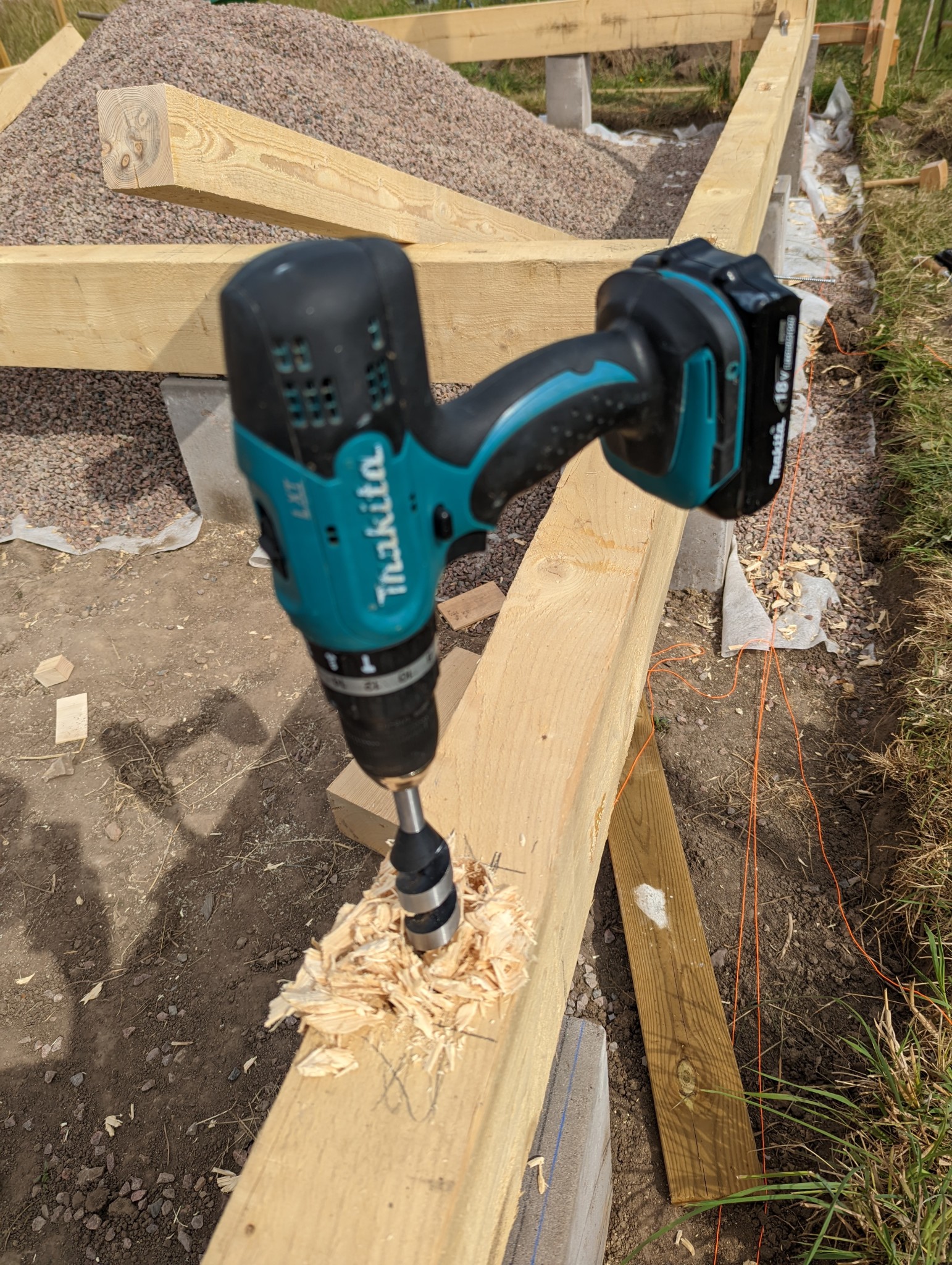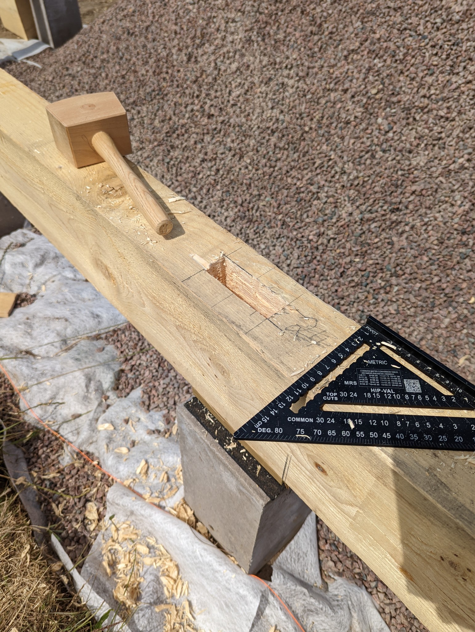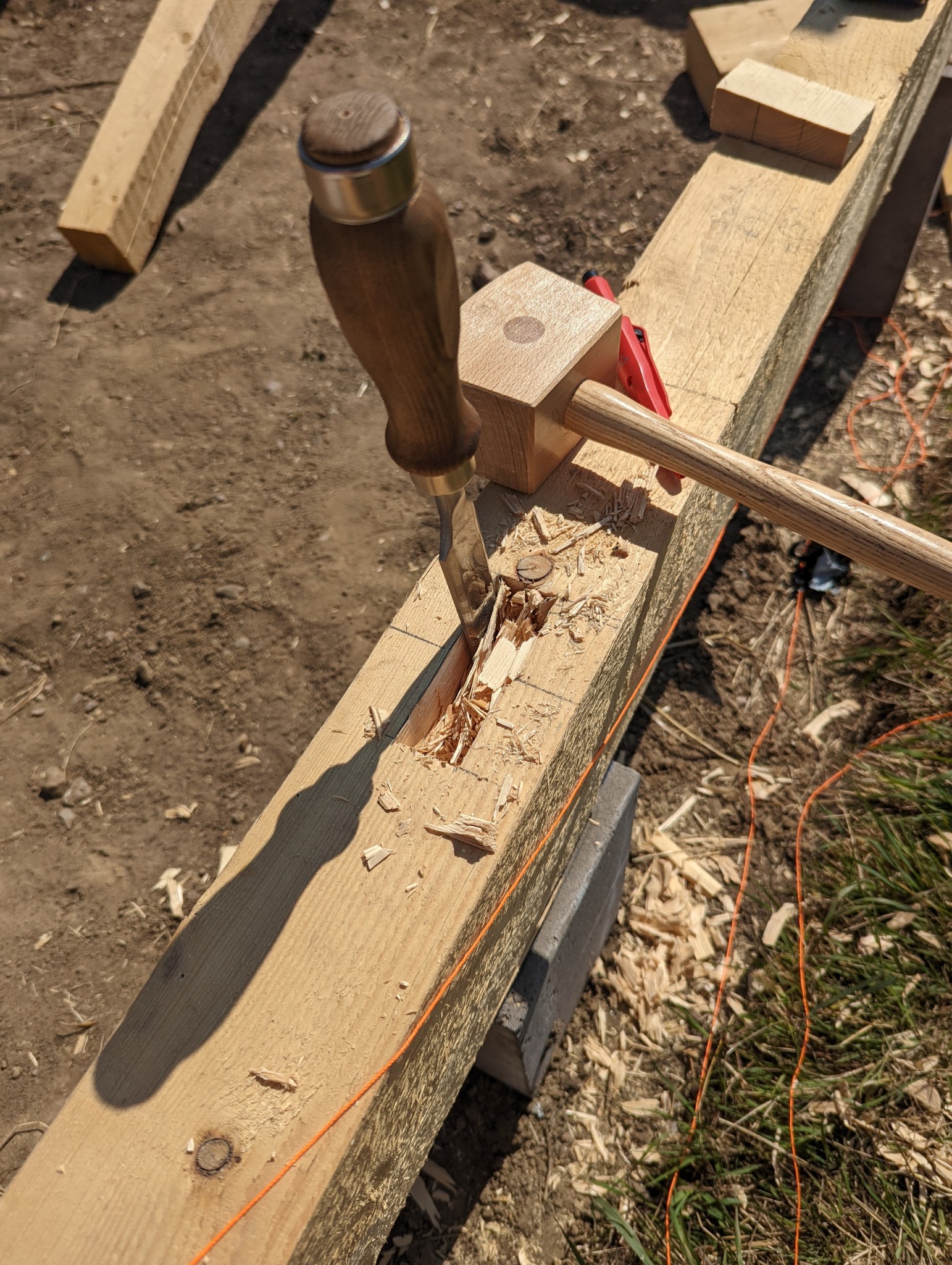 Tapparna fästs med dymlingar, stora träplugg som går genom tapp och bjälke, de görs med förskjutning så att de spänner ihop virket. Jag är rädd att mina tappar är lite korta för att fästas så, så det blir kanske en konstruktuonsskruv där med.