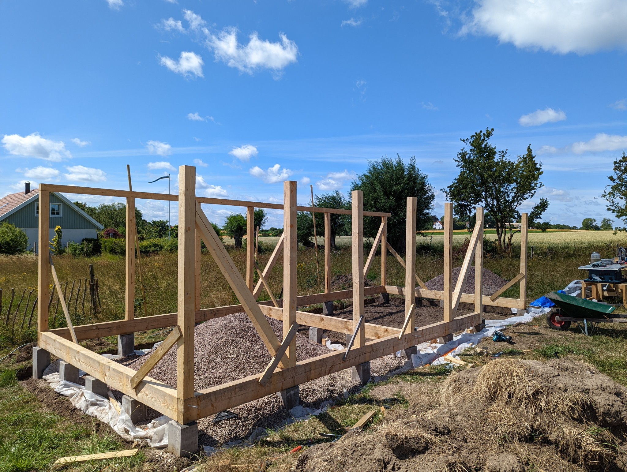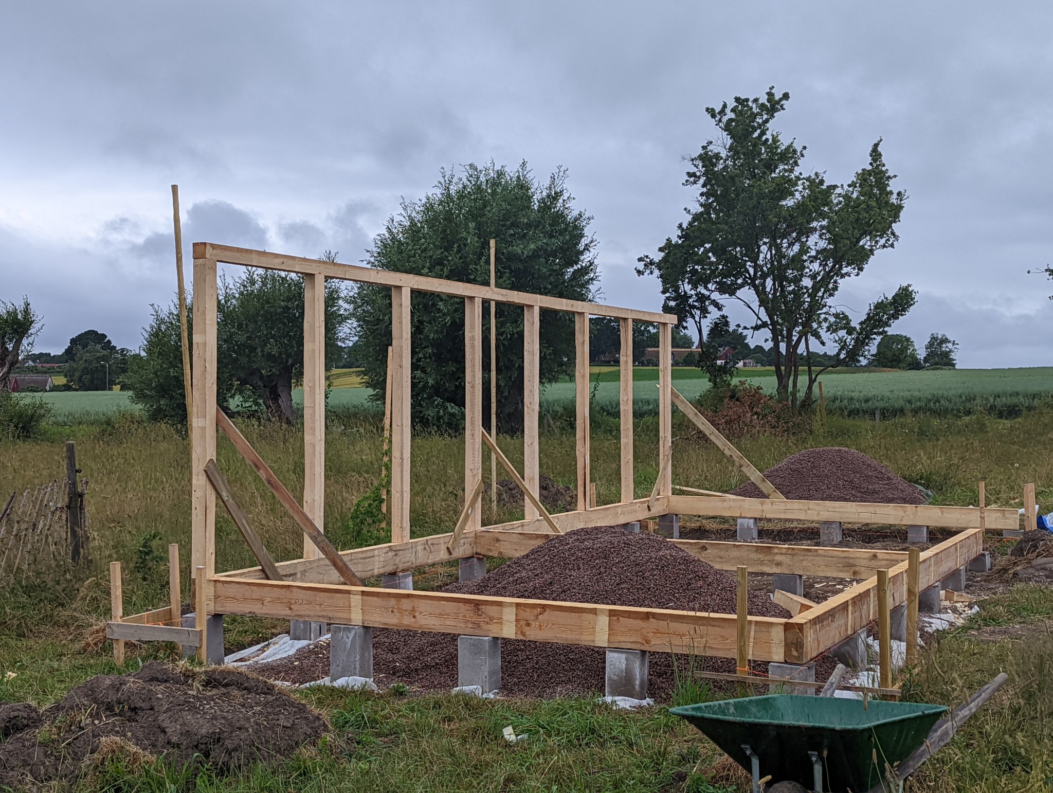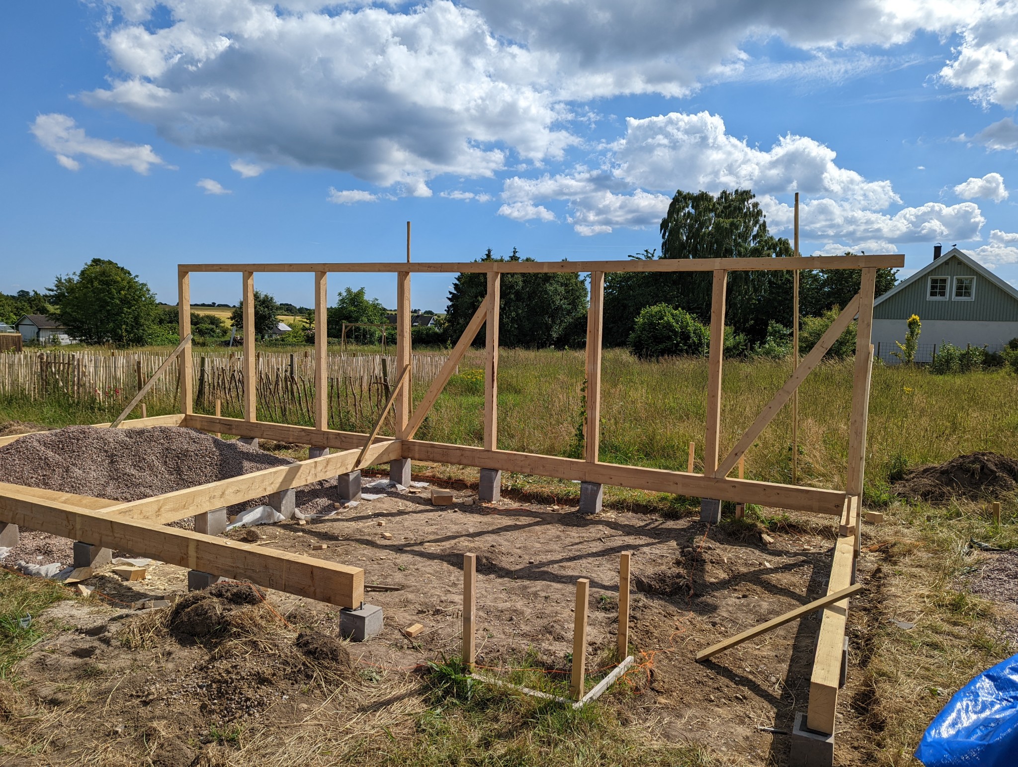 Nu är båda långsidorna färdiga, och sista takåsen kom på plats i eftermiddags ddags. Har även hunnit dränera och skrida ut gruset så det finns ett golv av något slag!