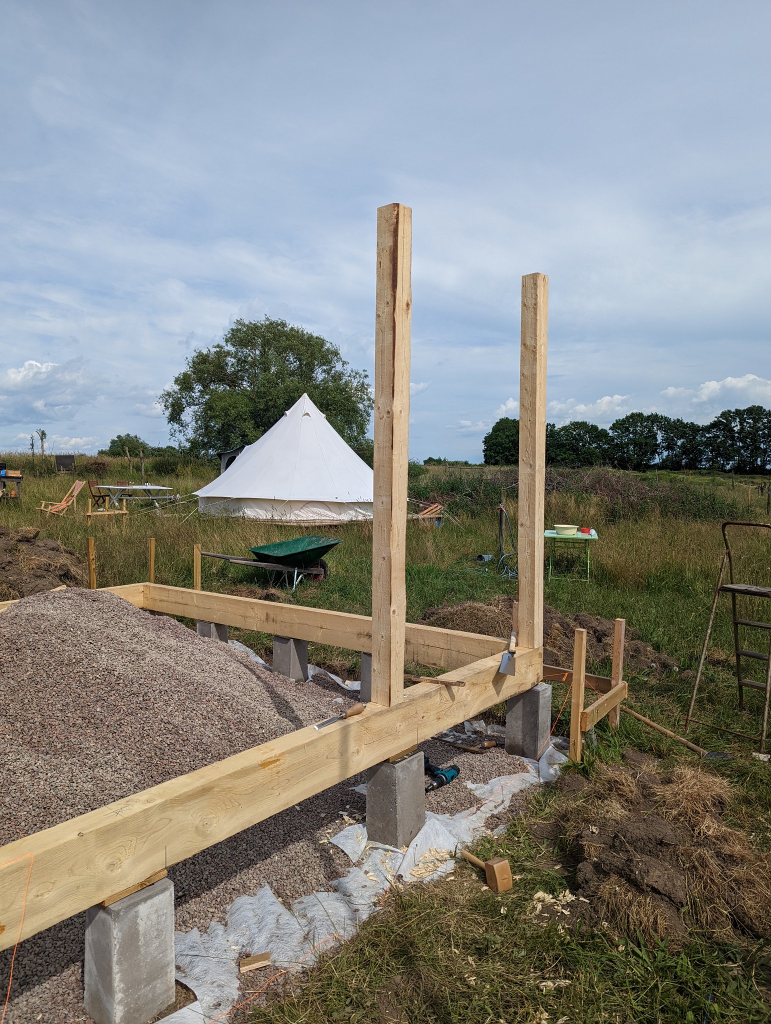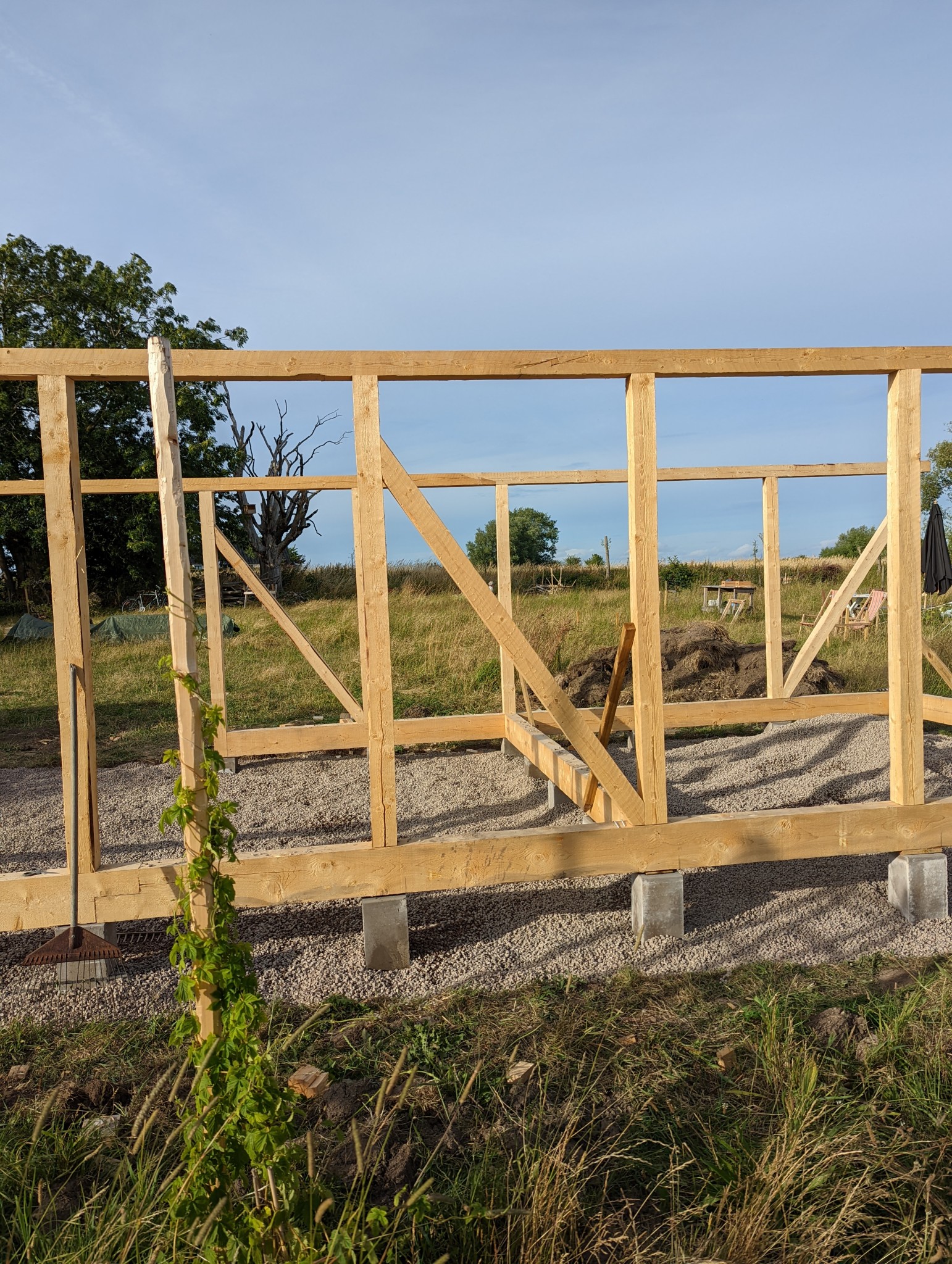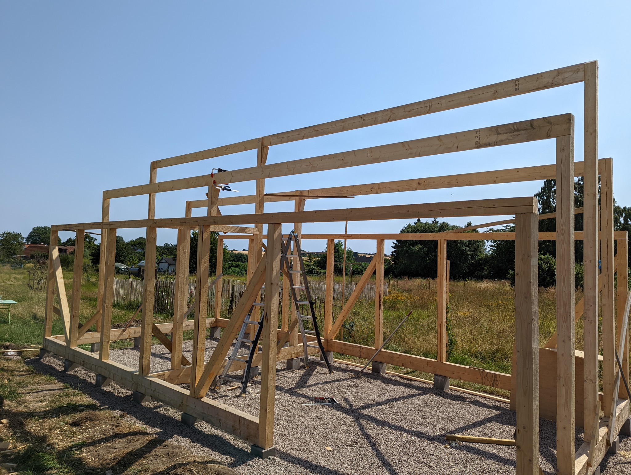 Nu är båda långsidorna färdiga, och sista takåsen kom på plats i eftermiddags ddags. Har även hunnit dränera och skrida ut gruset så det finns ett golv av något slag!